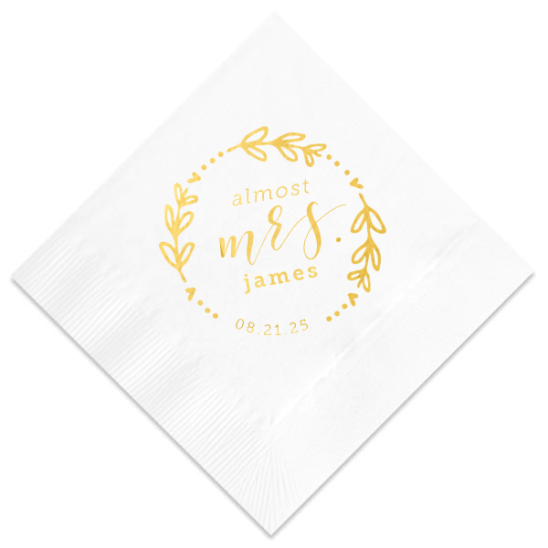 Zoom Show guides Loading product Almost Mrs Heart Frame Bridal Shower Napkin Diamond Cocktail Napkin Design ID: 199337 Click on swatch to see options Choose Your Napkin Color Active Color 3 ply 3 ply Top quality 3 ply. Dyed tissue. Sand Black Slate Platinum Platinum Pin Dot Dove Gray Dove Gray Borderless White White Borderless White Pin Dot White Scallop Ivory Ivory Borderless Mimosa Lemon Pin Dot Kiwi Kiwi Pin Dot Leaf Pin Dot Spruce Pin Dot Olive Pin Dot Light Navy Dark Turquoise Pin Dot Turquoise Powder Blue Pin Dot Lavender Lavender Pin Dot Merlot Fuchsia Candy Pink Antique Pink Pin Dot Ballet Pink Ballet Pink Borderless Convertible Red Light Coral Purple Out Until: 2025-12-04 Merlot Pin Dot Out Until: 2025-12-03 Tangerine Out Until: 2025-11-29 Linen Like* - Premium Product Linen Like* - Premium Product Absorbent. Dyed tissue. Airlaid. Premium pricing applies. Pebble Kraft Metallic Copper Ash Grey Brown Black Charcoal Stone Gray Metallic Silver Fog White Cream Buttercream Metallic Gold Lemon Moss Green Hunter Green Pastel Green Lime Eucalyptus Dark Turquoise Bright Sky Powder Blue Navy Lavender Berry Merlot Magenta Pastel Pink Pink Lipstick Red Terracotta Peach Mango Ivory Out Until: 2025-12-03 Olive Green Out Until: 2025-12-04 Plum Out Until: 2025-11-13 Crosshatch* - Premium Product Crosshatch* - Premium Product Absorbent. Printed tissue. Airlaid. Premium pricing applies. Crosshatch Black Crosshatch Gray Crosshatch Stone Crosshatch Turquoise Crosshatch Violet Crosshatch Fuchsia Crosshatch Lipstick Red Crosshatch Key Lime Out Until: 2025-11-26 Crosshatch Green Out Until: 2025-12-03 Crosshatch Navy Out Until: 2025-11-24 Woven* - Premium Product Woven* - Premium Product Basketweave texture. Single-sided color. Premium pricing applies. Woven Sand Woven Copper Woven Black Woven Slate Woven Silver Woven Stone Woven Vanilla Woven White Woven Gold Woven Sage Woven Spruce Woven Powder Blue Woven Navy Woven Mauve Woven Convertible Red Woven Tumeric Patterned* - Premium Product Patterned* - Premium Product Exclusive FYP patterns. Single-sided color. Pindot embossed edge. Product pricing applies. Oak Wood Walnut Wood Ebony Wood Ash Wood Birch Wood Marble Sand Marble Gray Marble Navy Marble Taupe Marble Blush Ombre Black Ombre Navy Ombre Robin’s Egg Blue Ombre Rose petal Ombre Coral Watercolor Sea Glass Watercolor Ocean Watercolor Nightfall Watercolor Sangria Watercolor Hibiscus Watercolor Rose Watercolor Sunrise Leaf Sand Leaf Fern Leaf Rain Leaf Rose Tie Dye Sunflower Tie Dye Leaf Tie Dye Turquoise Tie Dye Fuchsia Shimmer* - Premium Product Shimmer* - Premium Product Elegant European Stardream with iridescent finish. Single-sided color. Pindot embossed edge. Premium pricing applies. Champagne Soft Black Galvanized Silver Crystal White Ivory Pearl Gold Sage Navy Amethyst Herringbone* - Premium Product Herringbone* - Premium Product Absorbent. Printed Herringbone pattern. Airlaid. Premium pricing applies. Herringbone Vanilla Mocha Herringbone Gray Onyx Choose Your Imprint Foil Color Active Color Shiny Foil Shiny Foil Metallic, lustrous finish. *Specialty patterned foil may vary on final print Shiny Champagne Shiny Sterling Silver Shiny 18 Kt Gold Shiny Kiwi / Lime Shiny Leaf Shiny Jade Shiny Royal Blue Shiny Amethyst Shiny Fuchsia Shiny Rose Quartz Shiny Rose Gold NEW Shiny Merlot Shiny Convertible Red Shiny Poppy Shiny Copper *Shiny Holographic Gold *Shiny Holographic Silver *Shiny Rainbow Matte Foil Matte Foil Flat finish. Matte NEW Chocolate Matte Black Matte Slate Gray Matte Dove Grey Matte White Matte Ivory Matte Mimosa Yellow Matte Sunflower Matte Key Lime Matte Leaf Matte Spruce Matte Teal/Peacock Matte Azure Matte Royal Blue Matte Navy Matte Amethyst Matte Pastel Pink Matte Ballet Pink Matte Fuchsia Matte Lipstick Red Matte Merlot Matte Tangerine Satin Foil Satin Foil Muted sheen, brushed finish. Satin Sterling Silver Satin 18 Kt. Gold Satin Copper Penny Satin Fuchsia Satin Lipstick Red Satin Leaf Satin Teal / Peacock Satin French Blue Satin Plum Personalize Your Text Line 1 Line 2 Personalize further with different fonts, graphics, positioning, and sizes. (Optional) Customize More Choose Your Quantity Subtotal PRICE INCLUDES: Select a Proof Option: Print As Is I confirm that I have reviewed my design and I understand it will be produced as shown and no proof will be provided. Digital Proof + $15 I would like an expert FYP designer to look at my design, make minor corrections if necessary, and send me a black and white proof before the order is produced. Orders delivered as soon as 11.11.2025. Exclusions apply. Share Your Design About This Design The Almost Mrs Heart Frame Bridal Shower Napkin joyfully heralds the bride-to-be's journey from Miss to Mrs. Encircled by a heart-leaf frame, the flowing, swirling script of "Mrs." takes center stage, accompanied by her soon-to-be last name and the wedding date. A charming, celebratory design! Product Details Product Details Classic 3-ply tissue, 4.75” or 5” square Colors vary Signature foil stamp included Bulk discounts available Expedited shipping options available. Product Description Product Description Classic Cocktail Napkins are the perfect companion for any event. Add a touch of refinement to your cocktail parties, weddings, or birthday celebrations. Whether you're sipping a Martini, Old Fashioned, or a signature cocktail, these beverage napkins are the perfect accompaniment to elevate your drink service to new heights.Traditionally designed with a classic pleated edge, highly absorbent, durable, crafted from high-quality, premium-grade paper, our Classic Cocktail Napkins are an excellent, timeless choice. They are soft to the touch, keeping your guests' hands dry and your furniture protected. Once used, simply discard them, making cleanup a breeze. Explore our Cocktail Napkins Collection to find the perfect option for your event. Due to the complexities of manufacturing, the size of the embossed border on our 3-ply napkins may var