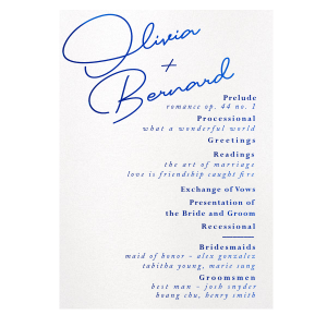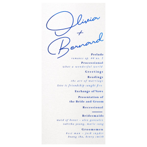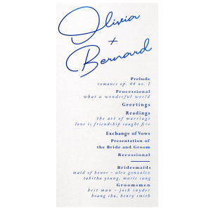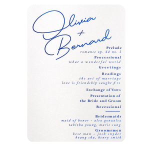 Zoom Show guides Loading product Angled Modern Couple Program 4.5 x 10 Program Design ID: 1747470 Click on swatch to see options Choose Your Paper Color Active Color Linen Linen Slightly textured, matte finish. Double-sided color. 100lb+ cover stock. Linen Convertible Red Linen Black Linen Slate Linen Antique Gray Linen White Linen Eggshell Linen Ivory Linen Pearl Cream Linen Navy Blue Shiny Shiny Smooth, high-gloss finish. Single-sided color. 100lb+ cover stock. Shiny Black Shiny White Shiny Navy Blue Shiny Fuchsia Shiny Convertible Red Stardream Stardream European Stardream with iridescent finish. Double-sided color. 105lb+ cover stock. Stardream NEW Black Stardream Galvanized Silver Stardream Silver Stardream Crystal White Stardream Ivory Stardream 18k Gold Stardream Champagne Stardream Old Gold Stardream Super Gold Stardream Orange Stardream Rose Gold Stardream Blush Stardream Ballet Pink Stardream Plum Stardream Violet Stardream Lavender Stardream Denim Stardream NEW Peacock Stardream Robin's Egg Blue Poptone Poptone Soft felt texture with matte finish. Double-sided color. 100lb+ cover stock. Poptone Ballet Pink Poptone NEW Fuchsia Poptone Convertible Red Poptone Tangerine Poptone Sunflower Poptone Yellow Poptone Mimosa Poptone Mint Poptone Robin’s Egg Blue Poptone Dark Turquoise Poptone Sky Blue Poptone NEW French Blue Poptone Lavender Natural Natural Smooth, matte finish. Double-sided color. 100lb+ cover stock. Natural NEW Sand Natural Spruce Natural Khaki Natural NEW Kraft Natural Mushroom Natural NEW Chocolate Natural Black Natural Slate Natural Clay Gray Natural Gray Natural Smoke Natural NEW Frost White Natural Ivory Natural Leaf Natural Dark Teal Natural NEW Amethyst Natural Scarlet Natural Antique Rose Natural Harvest Natural Dark Sage Textured Textured Variety of textures. Single-sided color. 110lb+ cover stock. Oak Wood Walnut Wood Ebony Wood Ash Wood Birch Wood Leather Like Tan Leather Like Black Leather Like Pearl Leather Like White Leather Like Night Blue Leather Like Lipstick Red Horizontal White Patterned* - Premium Product Patterned* - Premium Product Smooth, matte finish. Single-sided pattern with white back. Pattern and color may vary between products. 100 lb paper. Premium pricing applies. Marble Sand Marble Gray Marble Navy Marble Taupe Marble Blush Watercolor Seaglass Watercolor Ocean Watercolor Night Fall Watercolor Sangria Watercolor Hibiscus Watercolor Rose Watercolor Sunrise Leaf Sand Leaf Fern Leaf Rain Leaf Rose Blank Stock Blank Stock Blank Stock Glitter* - Premium Product Glitter* - Premium Product Sparkly with a slightly textured finish. Single-sided with a white back and 100lb+ cover stock. Premium pricing applies. Glitter NEW Black Glitter NEW Silver Glitter Champagne Glitter Rose Copper Glitter Night Fall Choose Your Imprint Foil Color Active Color Shiny Foil Shiny Foil Metallic, lustrous finish. *Specialty patterned foil may vary on final print Shiny Champagne Shiny Sterling Silver Shiny 18 Kt Gold Shiny Kiwi / Lime Shiny Leaf Shiny Jade Shiny Royal Blue Shiny Amethyst Shiny Fuchsia Shiny Rose Quartz Shiny Rose Gold NEW Shiny Merlot Shiny Convertible Red Shiny Poppy Shiny Copper *Shiny Holographic Gold *Shiny Holographic Silver *Shiny Rainbow Matte Foil Matte Foil Flat finish. Matte NEW Chocolate Matte Black Matte Slate Gray Matte Dove Grey Matte White Matte Ivory Matte Mimosa Yellow Matte Sunflower Matte Key Lime Matte Leaf Matte Spruce Matte Teal/Peacock Matte Azure Matte Royal Blue Matte Navy Matte Amethyst Matte Pastel Pink Matte Ballet Pink Matte Fuchsia Matte Lipstick Red Matte Merlot Matte Tangerine Satin Foil Satin Foil Muted sheen, brushed finish. Satin Sterling Silver Satin 18 Kt. Gold Satin Copper Penny Satin Fuchsia Satin Lipstick Red Satin Leaf Satin Teal / Peacock Satin French Blue Satin Plum Personalize Your Text Line 1 Line 2 Line 3 Line 4 Line 5 Line 6 Line 7 Line 8 Line 9 Line 10 Line 11 Line 12 Line 13 Line 14 Line 15 Line 16 Line 17 Line 18 Line 19 Line 20 Personalize further with different fonts, graphics, positioning, and sizes. (Optional) Customize More Choose Your Quantity Subtotal PRICE INCLUDES: Select a Proof Option: Print As Is I confirm that I have reviewed my design and I understand it will be produced as shown and no proof will be provided. Digital Proof + $15 I would like an expert FYP designer to look at my design, make minor corrections if necessary, and send me a black and white proof before the order is produced. Orders delivered as soon as 11.06.2025. Exclusions apply. Share Your Design About This Design The Angled Modern Couple Program offers a modern and minimal element to your wedding. Customize with details of your event to make sure your guests have all the pertinent information they need. A bold script font adds a touch of elegance. Product Details Product Details Minimum order of 25 Measures 4.5" wide by 10" high Signature foil stamp included Bulk discounts available Expedited shipping options available. Product Options 4.5 x 10 Program Program 5 x 7 Rounded Corner Program 5 x 7 Circle Program 4 x 8 Program Related Products 4.5 x 10 Program Program 5 x 7 Rounded Corner Program 5 x 7 Circle Program 4 x 8 Program