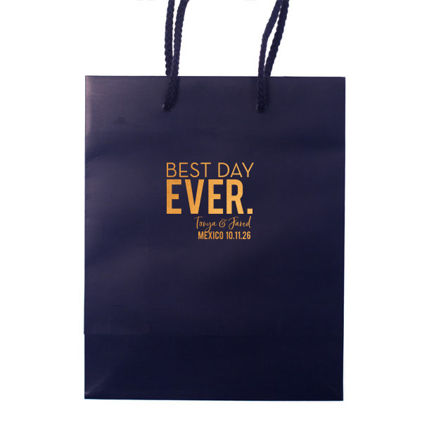 Zoom Show guides Loading product Best Day Ever Block Font Gift Bag Classic Gift Bag Design ID: 628609 Click on swatch to see options Choose Your Product Color Active Color Bag Colors Bag Colors Champagne Black Silver White Ivory Gold Navy Violet Ballet Pink Hot Pink Espresso Brown Out Until: 2026-01-10 Choose Your Imprint Foil Color Active Color Shiny Foil Shiny Foil Metallic, lustrous finish. *Specialty patterned foil may vary on final print Shiny Champagne Shiny Sterling Silver Shiny 18 Kt Gold Shiny Kiwi / Lime Shiny Leaf Shiny Jade Shiny Royal Blue Shiny Amethyst Shiny Fuchsia Shiny Rose Quartz Shiny Rose Gold NEW Shiny Merlot Shiny Convertible Red Shiny Poppy Shiny Copper *Shiny Holographic Gold *Shiny Holographic Silver *Shiny Rainbow Matte Foil Matte Foil Flat finish. Matte NEW Chocolate Matte Black Matte Slate Gray Matte Dove Grey Matte White Matte Ivory Matte Mimosa Yellow Matte Sunflower Matte Key Lime Matte Leaf Matte Spruce Matte Teal/Peacock Matte Azure Matte Royal Blue Matte Navy Matte Amethyst Matte Pastel Pink Matte Ballet Pink Matte Fuchsia Matte Lipstick Red Matte Merlot Matte Tangerine Satin Foil Satin Foil Muted sheen, brushed finish. Satin Sterling Silver Satin 18 Kt. Gold Satin Copper Penny Satin Fuchsia Satin Lipstick Red Satin Leaf Satin Teal / Peacock Satin French Blue Satin Plum Choose Your Tissue Color Active Color Tissue Paper Tissue Paper Turquoise 10 sheets Lavender 10 sheets Pink 8 sheets Red 8 sheets None Brown 10 sheets Out Until: 2025-12-01 Black 10 sheets Out Until: 2025-12-01 Ivory 10 sheets Out Until: 2025-12-01 Royal Blue 10 sheets Out Until: 2025-12-01 Light Blue 10 sheets Out Until: 2025-12-01 Fuchsia 10 sheets Out Until: 2025-12-01 Personalize Your Text Line 1 Line 2 Personalize further with different fonts, graphics, positioning, and sizes. (Optional) Customize More Choose Your Quantity Subtotal PRICE INCLUDES: Select a Proof Option: Print As Is I confirm that I have reviewed my design and I understand it will be produced as shown and no proof will be provided. Digital Proof + $15 I would like an expert FYP designer to look at my design, make minor corrections if necessary, and send me a black and white proof before the order is produced. Orders delivered as soon as 12.19.2025. Exclusions apply. Share Your Design About This Design ForYourParty's chic Metallic Silver Gift Bag with Shiny Copper Foil are a must-have for your next event—whatever the celebration! Product Details Product Details Minimum order of 35 Measures 8" wide by 9" high by 4.75" deep Gusseted design with a satin finish and rope-like handles Expedited shipping options available. Product Description Product Description Custom-designed classic gift bags are the perfect finishing touch to your gifts, wedding welcome bags, and party favors. With an ample selection of bag colors, foil-stamping colors, and sheens, as well as galleries of curated designs, you'll have no problem creating a custom classic gift bag that will perfectly match your event.Our classic gift bags are made of high-quality paper with a satin sheen and feature luxurious braided rope handles. Order yours today and elevate your gift-giving game! Explore our other favor bags. Product Options Classic Gift Bag Gift Bag Wine Gift Bag Related Products Classic Gift Bag Gift Bag Wine Gift Bag