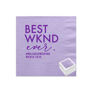Zoom Show guides Loading product Best WKND ever Napkin Reception Set Cocktail Napkin Reception Set Design ID: 2119861 Click on swatch to see options Choose Your Product Color Active Color Linen Like* - Premium Product Linen Like* - Premium Product Absorbent. Dyed tissue. Airlaid. Premium pricing applies. Pebble Kraft Ash Grey Black Charcoal Stone Gray Fog White Cream Buttercream Lemon Moss Green Hunter Green Pastel Green Lime Eucalyptus Dark Turquoise Bright Sky Powder Blue Navy Lavender Magenta Pastel Pink Pink Terracotta Peach Mango Brown Out Until: 2025-12-26 Ivory Out Until: 2026-01-02 Olive Green Out Until: 2025-12-26 Berry Out Until: 2025-12-28 Merlot Out Until: 2025-12-25 Lipstick Red Out Until: 2025-12-19 Choose Your Imprint Foil Color Active Color Shiny Foil Shiny Foil Metallic, lustrous finish. *Specialty patterned foil may vary on final print Shiny Champagne Shiny Sterling Silver Shiny 18 Kt Gold Shiny Kiwi / Lime Shiny Leaf Shiny Jade Shiny Royal Blue Shiny Amethyst Shiny Fuchsia Shiny Rose Quartz Shiny Rose Gold NEW Shiny Merlot Shiny Convertible Red Shiny Poppy Shiny Copper *Shiny Holographic Gold *Shiny Holographic Silver *Shiny Rainbow Matte Foil Matte Foil Flat finish. Matte NEW Chocolate Matte Black Matte Slate Gray Matte Dove Grey Matte White Matte Ivory Matte Mimosa Yellow Matte Sunflower Matte Key Lime Matte Leaf Matte Spruce Matte Teal/Peacock Matte Azure Matte Royal Blue Matte Navy Matte Amethyst Matte Pastel Pink Matte Ballet Pink Matte Fuchsia Matte Lipstick Red Matte Merlot Matte Tangerine Satin Foil Satin Foil Muted sheen, brushed finish. Satin Sterling Silver Satin 18 Kt. Gold Satin Copper Penny Satin Fuchsia Satin Lipstick Red Satin Leaf Satin Teal / Peacock Satin French Blue Satin Plum Choose Your Reception Boxe Active Color Napkin Gift Boxes Napkin Gift Boxes Gift Box Personalize Your Text Line 1 Line 2 Personalize further with different fonts, graphics, positioning, and sizes. (Optional) Customize More Choose Your Quantity Subtotal PRICE INCLUDES: Select a Proof Option: Print As Is I confirm that I have reviewed my design and I understand it will be produced as shown and no proof will be provided. Digital Proof + $15 I would like an expert FYP designer to look at my design, make minor corrections if necessary, and send me a black and white proof before the order is produced. Orders delivered as soon as 12.19.2025. Exclusions apply. Share Your Design About This Design The most wanted napkin set of all time, leaving a great memory behind. The Best WKND ever Napkin Reception Set will bring unforgettable moments, your friends will agree! Product Details Product Details Minimum order of 75 White napkin holder base with clear lid Wrapped with your choice of gold, silver, or red elastic bow Expedited shipping options available. Product Options Cocktail Napkin Reception Set Cocktail Napkin Reception Set Related Products Cocktail Napkin Reception Set Cocktail Napkin Reception Set