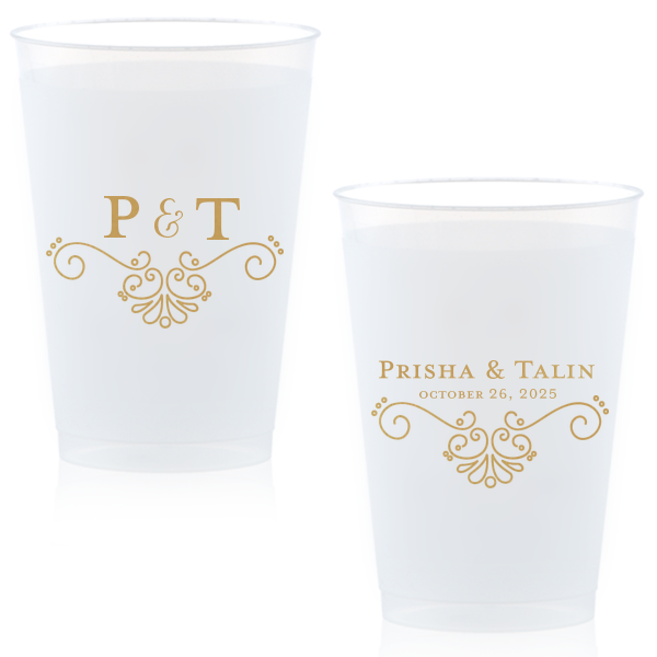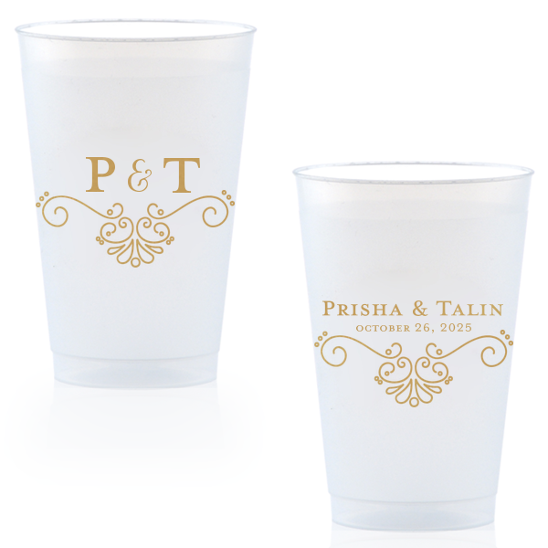 Zoom Show guides Loading product Elegant Flourish Wedding Cup 16-oz. Frosted Cup Design ID: 9142 Click on swatch to see options Choose Your Screen Print Active Color Metallic Cup Ink Metallic Cup Ink Silver Ink Gold Ink Copper Ink Matte Cup Ink Matte Cup Ink Matte Chocolate Ink Matte Black Ink Matte Slate Gray Ink Matte White Ink Matte Sunflower Ink Matte Moss Green Ink Matte Sage Ink Matte Leaf Ink Matte Spruce Matte Teal/Peacock Ink Matte Sky Blue Ink Matte French Blue Ink Matte Royal Blue Ink Matte Navy Ink Matte Cobalt Ink Matte Lavender Ink Matte Ballet Pink Ink Matte Fuchsia Ink Matte Lipstick Red Ink Matte Merlot Ink Matte Tangerine Ink Personalize Your Text Left Initial Right Initial Line 1 - Back Line 2 - Back Personalize further with different fonts, graphics, positioning, and sizes. (Optional) Customize More Choose Your Quantity Subtotal PRICE INCLUDES: Select a Proof Option: Print As Is I confirm that I have reviewed my design and I understand it will be produced as shown and no proof will be provided. Digital Proof + $15 I would like an expert FYP designer to look at my design, make minor corrections if necessary, and send me a black and white proof before the order is produced. Orders delivered as soon as 11.06.2025. Exclusions apply. Share Your Design About This Design Sip in style with the Elegant Flourish Wedding Cup, where modern meets vintage in a curvy French flourish. Initials entwine with a swirly ampersand, while names and date sit elegantly above the same sophisticated swirl, toasting to timeless romance. Product Details Product Details Minimum order of 50 Measures 4.5" tall and 3.5" wide at the top Holds 15.1 oz flush fill volume Ideal for beer BPA-free and recyclable Shatterproof and top-rack dishwasher safe Bulk discounts available Expedited shipping options available. Product Description Product Description Frost flex cups from For Your Party are a perfect accent to any event, from weddings to birthdays. Their translucent plastic complements any drink or color scheme, and can have any art you can imagine. They’re also reusable, so your guests can have a keepsake from your special day. Like our 14 oz. frost flex cups , our 16 oz. frost flex cups are made in the USA, BPA free, and can be hand-washed again and again to remember your event. Our 16 oz. size is perfect for beer or signature cocktails, and has a flush fill volume of 15.1 oz. Product Options 16-oz. Frosted Cup 9-oz. Frosted Cup 10-oz.Frosted Cup 12-oz. Frosted Cup 14-oz.Frosted Cup 24-oz. Frosted Cup 20-oz. Frosted Cup Related Products 16-oz. Frosted Cup 9-oz. Frosted Cup 10-oz.Frosted Cup 12-oz. Frosted Cup 14-oz.Frosted Cup 24-oz. Frosted Cup 20-oz. Frosted Cup
