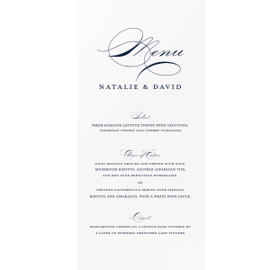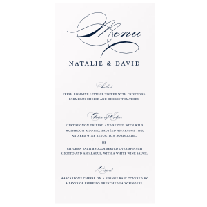 Zoom Show guides Loading product Elegant Script Wedding Menu Menu 5"x7" Design ID: 54935 Click on swatch to see options Choose Your Paper Color Active Color Linen Linen Slightly textured, matte finish. Double-sided color. 100lb+ cover stock. Linen Convertible Red Linen Black Linen Slate Linen Antique Gray Linen White Linen Eggshell Linen Ivory Linen Pearl Cream Linen Navy Blue Shiny Shiny Smooth, high-gloss finish. Single-sided color. 100lb+ cover stock. Shiny Black Shiny White Shiny Navy Blue Shiny Fuchsia Shiny Convertible Red Stardream Stardream European Stardream with iridescent finish. Double-sided color. 105lb+ cover stock. Stardream NEW Black Stardream Galvanized Silver Stardream Silver Stardream Crystal White Stardream Ivory Stardream 18k Gold Stardream Champagne Stardream Old Gold Stardream Super Gold Stardream Orange Stardream Rose Gold Stardream Blush Stardream Ballet Pink Stardream Plum Stardream Violet Stardream Lavender Stardream Denim Stardream NEW Peacock Stardream Robin's Egg Blue Poptone Poptone Soft felt texture with matte finish. Double-sided color. 100lb+ cover stock. Poptone Ballet Pink Poptone NEW Fuchsia Poptone Convertible Red Poptone Tangerine Poptone Sunflower Poptone Yellow Poptone Mimosa Poptone Mint Poptone Robin’s Egg Blue Poptone Dark Turquoise Poptone Sky Blue Poptone NEW French Blue Poptone Lavender Natural Natural Smooth, matte finish. Double-sided color. 100lb+ cover stock. Natural NEW Sand Natural Spruce Natural Khaki Natural NEW Kraft Natural Mushroom Natural NEW Chocolate Natural Black Natural Slate Natural Gray Natural Smoke Natural NEW Frost White Natural Ivory Natural Leaf Natural Dark Teal Natural NEW Amethyst Natural Scarlet Natural Antique Rose Natural Harvest Natural Dark Sage Textured Textured Variety of textures. Single-sided color. 110lb+ cover stock. Oak Wood Walnut Wood Ebony Wood Ash Wood Birch Wood Leather Like Tan Leather Like Black Leather Like Pearl Leather Like White Leather Like Night Blue Leather Like Lipstick Red Horizontal White Patterned* - Premium Product Patterned* - Premium Product Smooth, matte finish. Single-sided pattern with white back. Pattern and color may vary between products. 100 lb paper. Premium pricing applies. Marble Sand Marble Gray Marble Navy Marble Taupe Marble Blush Watercolor Seaglass Watercolor Ocean Watercolor Night Fall Watercolor Sangria Watercolor Hibiscus Watercolor Rose Watercolor Sunrise Leaf Sand Leaf Fern Leaf Rain Leaf Rose Blank Stock Blank Stock Blank Stock Glitter* - Premium Product Glitter* - Premium Product Sparkly with a slightly textured finish. Single-sided with a white back and 100lb+ cover stock. Premium pricing applies. Glitter NEW Black Glitter NEW Silver Glitter Champagne Glitter Rose Copper Glitter Night Fall Choose Your Imprint Foil Color Active Color Shiny Foil Shiny Foil Metallic, lustrous finish. *Specialty patterned foil may vary on final print Shiny Champagne Shiny Sterling Silver Shiny 18 Kt Gold Shiny Kiwi / Lime Shiny Leaf Shiny Jade Shiny Royal Blue Shiny Amethyst Shiny Fuchsia Shiny Rose Quartz Shiny Rose Gold NEW Shiny Merlot Shiny Convertible Red Shiny Poppy Shiny Copper *Shiny Holographic Gold *Shiny Holographic Silver *Shiny Rainbow Matte Foil Matte Foil Flat finish. Matte NEW Chocolate Matte Black Matte Slate Gray Matte Dove Grey Matte White Matte Ivory Matte Mimosa Yellow Matte Sunflower Matte Key Lime Matte Leaf Matte Spruce Matte Teal/Peacock Matte Azure Matte Royal Blue Matte Navy Matte Amethyst Matte Pastel Pink Matte Ballet Pink Matte Fuchsia Matte Lipstick Red Matte Merlot Matte Tangerine Satin Foil Satin Foil Muted sheen, brushed finish. Satin Sterling Silver Satin 18 Kt. Gold Satin Copper Penny Satin Fuchsia Satin Lipstick Red Satin Leaf Satin Teal / Peacock Satin French Blue Satin Plum Personalize Your Text Line 1 Line 2 Line 3 Line 4 Line 5 Line 6 Line 7 Line 8 Line 9 Line 10 Line 11 Line 12 Line 13 Line 14 Line 15 Personalize further with different fonts, graphics, positioning, and sizes. (Optional) Customize More Choose Your Quantity Subtotal PRICE INCLUDES: Select a Proof Option: Print As Is I confirm that I have reviewed my design and I understand it will be produced as shown and no proof will be provided. Digital Proof + $15 I would like an expert FYP designer to look at my design, make minor corrections if necessary, and send me a black and white proof before the order is produced. Orders delivered as soon as 11.20.2025. Exclusions apply. Share Your Design About This Design Serve up sophistication with the Elegant Script Wedding Menu, graced by a royal flourish that announces 'Menu' with panache. Beneath, the couple’s names introduce a culinary narrative, setting the stage for a sumptuous spread detailed in elegant script. Product Details Product Details Minimum order of 25 Measures 5" wide by 7" high Signature foil stamp included Bulk discounts available Expedited shipping options available. Product Description Product Description Our Custom Classic Menu 4.75" x 6.75" is the perfect addition to elevate your party experience! Tailored to your unique theme, this customizable menu adds a touch of elegance and personalization to your celebrations. Whether it's a lavish wedding reception, a milestone birthday bash, or a corporate gala, our Classic Menu enhances the aesthetic of your event. Choose from a wide range of designs and fonts to create a menu that perfectly complements your style. Explore our customizable options at For Your Party to make your event truly unforgettable. Crafted with the utmost quality and attention to detail, our Classic Menu boasts a premium texture that exudes sophistication. Printed on durable, high-grade paper, it withstands the test of time while maintaining its pristine look. With its compact size, it's both convenient to handle and easy to display, ensuring a seamless experience for both hosts and guests. The Classic Menu not only adds an air of refinement to your event but also serves as a functional piece that gui