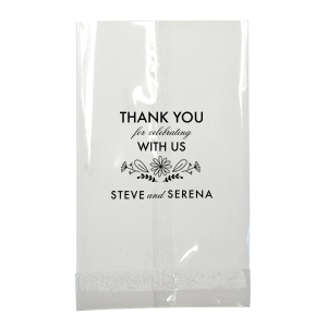 Zoom Show guides Loading product Floral Thank You Wedding Gift Bag Large Cellophane Bag Design ID: 9636 Click on swatch to see options Choose Your Imprint Foil Color Active Color Shiny Foil Shiny Foil Metallic, lustrous finish. *Specialty patterned foil may vary on final print Shiny Champagne Shiny Sterling Silver Shiny 18 Kt Gold Shiny Kiwi / Lime Shiny Leaf Shiny Jade Shiny Royal Blue Shiny Amethyst Shiny Fuchsia Shiny Rose Quartz Shiny Rose Gold NEW Shiny Merlot Shiny Convertible Red Shiny Poppy Shiny Copper *Shiny Holographic Gold *Shiny Holographic Silver *Shiny Rainbow Matte Foil Matte Foil Flat finish. Matte NEW Chocolate Matte Black Matte Slate Gray Matte Dove Grey Matte White Matte Ivory Matte Mimosa Yellow Matte Sunflower Matte Key Lime Matte Leaf Matte Spruce Matte Teal/Peacock Matte Azure Matte Royal Blue Matte Navy Matte Amethyst Matte Pastel Pink Matte Ballet Pink Matte Fuchsia Matte Lipstick Red Matte Merlot Matte Tangerine Satin Foil Satin Foil Muted sheen, brushed finish. Satin Sterling Silver Satin 18 Kt. Gold Satin Copper Penny Satin Fuchsia Satin Lipstick Red Satin Leaf Satin Teal / Peacock Satin French Blue Satin Plum Choose Your Tissue Color Active Color Tissue Paper Tissue Paper Turquoise 10 sheets Lavender 10 sheets Pink 8 sheets Red 8 sheets None Brown 10 sheets Out Until: 2025-10-30 Black 10 sheets Out Until: 2025-10-29 Ivory 10 sheets Out Until: 2025-10-30 Royal Blue 10 sheets Out Until: 2025-11-27 Light Blue 10 sheets Out Until: 2025-10-30 Fuchsia 10 sheets Out Until: 2025-10-30 Personalize Your Text Name 1 Name 2 Personalize further with different fonts, graphics, positioning, and sizes. (Optional) Customize More Choose Your Quantity Subtotal PRICE INCLUDES: Select a Proof Option: Print As Is I confirm that I have reviewed my design and I understand it will be produced as shown and no proof will be provided. Digital Proof + $15 I would like an expert FYP designer to look at my design, make minor corrections if necessary, and send me a black and white proof before the order is produced. Orders delivered as soon as 11.06.2025. Exclusions apply. Share Your Design About This Design Express heartfelt thanks with the Floral Thank You Wedding Gift Bag, adorned with hand-drawn blooms and a sincere stacked message. This energetic design, featuring the couple's names, offers a sweet token of appreciation for your cherished guests. Product Details Product Details Minimum order of 25 Measures 4" wide by 9" high Non-gusseted clear plastic Bulk discounts available Expedited shipping options available. Product Description Product Description Our Custom Large Cellophane Bags are the ultimate choice for adding a personalized and practical touch to your party favors and goodies. Ideal for weddings, holiday gatherings, corporate parties, and large-scale celebrations, our custom cellophane bags allow you to make a lasting impression on your guests. Crafted with top-quality cellophane material, our bags offer exceptional texture and durability, ensuring your treats remain fresh and presentable. These bags are incredibly convenient to use, allowing you to effortlessly display and distribute your party favors. With a multitude of customizable designs, you can easily match them to your event's theme or color palette. Check out our other bags too! Product Options Large Cellophane Bag Small Cellophane Bag Popcorn Bag Gloss Goodie Bag Cookie Bag Lunch Bag Gift Bag Classic Gift Bag Classic Wine Bag Wine Gift Bag Related Products Large Cellophane Bag Small Cellophane Bag Popcorn Bag Gloss Goodie Bag Cookie Bag Lunch Bag Gift Bag Classic Gift Bag Classic Wine Bag Wine Gift Bag