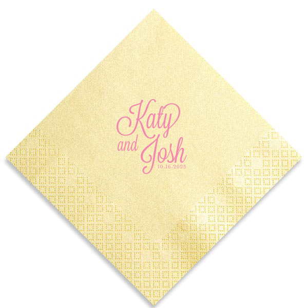 Zoom Show guides Loading product Formal Names Wedding Napkin Diamond Cocktail Napkin Design ID: 4671 Click on swatch to see options Choose Your Napkin Color Active Color 3 ply 3 ply Top quality 3 ply. Dyed tissue. Sand Black Slate Platinum Platinum Pin Dot Dove Gray Dove Gray Borderless White White Borderless White Pin Dot White Scallop Ivory Ivory Borderless Mimosa Lemon Pin Dot Kiwi Kiwi Pin Dot Leaf Pin Dot Spruce Pin Dot Olive Pin Dot Light Navy Dark Turquoise Pin Dot Turquoise Powder Blue Pin Dot Lavender Lavender Pin Dot Purple Fuchsia Candy Pink Antique Pink Pin Dot Ballet Pink Ballet Pink Borderless Convertible Red Light Coral Merlot Out Until: 2025-11-06 Merlot Pin Dot Out Until: 2025-11-28 Tangerine Out Until: 2025-10-28 Linen Like* - Premium Product Linen Like* - Premium Product Absorbent. Dyed tissue. Airlaid. Premium pricing applies. Pebble Kraft Metallic Copper Ash Grey Black Charcoal Stone Gray Metallic Silver Fog White Ivory Cream Buttercream Metallic Gold Lemon Moss Green Olive Green Hunter Green Pastel Green Lime Eucalyptus Dark Turquoise Bright Sky Powder Blue Navy Lavender Berry Merlot Magenta Pastel Pink Pink Lipstick Red Terracotta Peach Mango Brown Out Until: 2025-11-21 Plum Out Until: 2025-11-13 Crosshatch* - Premium Product Crosshatch* - Premium Product Absorbent. Printed tissue. Airlaid. Premium pricing applies. Crosshatch Black Crosshatch Gray Crosshatch Stone Crosshatch Green Crosshatch Turquoise Crosshatch Violet Crosshatch Fuchsia Crosshatch Lipstick Red Crosshatch Key Lime Out Until: 2025-11-26 Crosshatch Navy Out Until: 2025-11-24 Woven* - Premium Product Woven* - Premium Product Basketweave texture. Single-sided color. Premium pricing applies. Woven Sand Woven Copper Woven Black Woven Slate Woven Silver Woven Stone Woven Vanilla Woven White Woven Gold Woven Sage Woven Spruce Woven Powder Blue Woven Navy Woven Mauve Woven Convertible Red Woven Tumeric Patterned* - Premium Product Patterned* - Premium Product Exclusive FYP patterns. Single-sided color. Pindot embossed edge. Product pricing applies. Oak Wood Walnut Wood Ebony Wood Ash Wood Birch Wood Marble Sand Marble Gray Marble Navy Marble Taupe Marble Blush Ombre Black Ombre Navy Ombre Robin’s Egg Blue Ombre Rose petal Ombre Coral Watercolor Sea Glass Watercolor Ocean Watercolor Nightfall Watercolor Sangria Watercolor Hibiscus Watercolor Rose Watercolor Sunrise Leaf Sand Leaf Fern Leaf Rain Leaf Rose Tie Dye Sunflower Tie Dye Leaf Tie Dye Turquoise Tie Dye Fuchsia Shimmer* - Premium Product Shimmer* - Premium Product Elegant European Stardream with iridescent finish. Single-sided color. Pindot embossed edge. Premium pricing applies. Champagne Soft Black Galvanized Silver Crystal White Ivory Pearl Gold Sage Navy Amethyst Herringbone* - Premium Product Herringbone* - Premium Product Absorbent. Printed Herringbone pattern. Airlaid. Premium pricing applies. Herringbone Vanilla Mocha Herringbone Gray Onyx Choose Your Imprint Foil Color Active Color Shiny Foil Shiny Foil Metallic, lustrous finish. *Specialty patterned foil may vary on final print Shiny Champagne Shiny Sterling Silver Shiny 18 Kt Gold Shiny Kiwi / Lime Shiny Leaf Shiny Jade Shiny Royal Blue Shiny Amethyst Shiny Fuchsia Shiny Rose Quartz Shiny Rose Gold NEW Shiny Merlot Shiny Convertible Red Shiny Poppy Shiny Copper *Shiny Holographic Gold *Shiny Holographic Silver *Shiny Rainbow Matte Foil Matte Foil Flat finish. Matte NEW Chocolate Matte Black Matte Slate Gray Matte Dove Grey Matte White Matte Ivory Matte Mimosa Yellow Matte Sunflower Matte Key Lime Matte Leaf Matte Spruce Matte Teal/Peacock Matte Azure Matte Royal Blue Matte Navy Matte Amethyst Matte Pastel Pink Matte Ballet Pink Matte Fuchsia Matte Lipstick Red Matte Merlot Matte Tangerine Satin Foil Satin Foil Muted sheen, brushed finish. Satin Sterling Silver Satin 18 Kt. Gold Satin Copper Penny Satin Fuchsia Satin Lipstick Red Satin Leaf Satin Teal / Peacock Satin French Blue Satin Plum Personalize Your Text Line 1 Line 2 Line 3 Line 4 Personalize further with different fonts, graphics, positioning, and sizes. (Optional) Customize More Choose Your Quantity Subtotal PRICE INCLUDES: Select a Proof Option: Print As Is I confirm that I have reviewed my design and I understand it will be produced as shown and no proof will be provided. Digital Proof + $15 I would like an expert FYP designer to look at my design, make minor corrections if necessary, and send me a black and white proof before the order is produced. Orders delivered as soon as 11.04.2025. Exclusions apply. Share Your Design About This Design Embrace elegance with the Formal Names Wedding Napkin, where sophistication meets celebration. The couple's names are beautifully scripted, adorned with curls and swirls. This stylish design, accented with the event date, adds a refined touch, making every detail of your special day memorable. Product Details Product Details Classic 3-ply tissue, 4.75” or 5” square Colors vary Signature foil stamp included Bulk discounts available Expedited shipping options available. Product Description Product Description Classic Cocktail Napkins are the perfect companion for any event. Add a touch of refinement to your cocktail parties, weddings, or birthday celebrations. Whether you're sipping a Martini, Old Fashioned, or a signature cocktail, these beverage napkins are the perfect accompaniment to elevate your drink service to new heights.Traditionally designed with a classic pleated edge, highly absorbent, durable, crafted from high-quality, premium-grade paper, our Classic Cocktail Napkins are an excellent, timeless choice. They are soft to the touch, keeping your guests' hands dry and your furniture protected. Once used, simply discard them, making cleanup a breeze. Explore our Cocktail Napkins Collection to find the perfect option for your event. Due to the complexities of manufacturing, the size of the embossed border on our 3-ply napkins may vary slightly. These discrepancies are a natural pa
