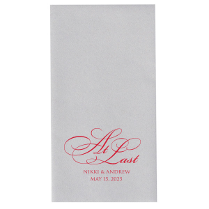 Zoom Show guides Loading product Formal Script At Last Wedding Napkin Square Cocktail Napkin Design ID: 1357764 Click on swatch to see options Choose Your Product Color Active Color 3 ply 3 ply Top quality 3 ply. Dyed tissue. Sand Black Slate Platinum Platinum Pin Dot Dove Gray Dove Gray Borderless White White Borderless White Pin Dot White Scallop Ivory Ivory Borderless Mimosa Lemon Pin Dot Kiwi Kiwi Pin Dot Leaf Pin Dot Spruce Pin Dot Olive Pin Dot Light Navy Dark Turquoise Pin Dot Turquoise Powder Blue Pin Dot Lavender Lavender Pin Dot Purple Fuchsia Candy Pink Antique Pink Pin Dot Ballet Pink Ballet Pink Borderless Convertible Red Light Coral Merlot Out Until: 2025-11-29 Merlot Pin Dot Out Until: 2025-11-29 Tangerine Out Until: 2025-11-29 Linen Like* - Premium Product Linen Like* - Premium Product Absorbent. Dyed tissue. Airlaid. Premium pricing applies. Pebble Kraft Metallic Copper Ash Grey Black Charcoal Stone Gray Metallic Silver Fog White Ivory Cream Buttercream Metallic Gold Lemon Moss Green Olive Green Hunter Green Pastel Green Lime Eucalyptus Dark Turquoise Bright Sky Powder Blue Navy Lavender Berry Merlot Magenta Pink Pastel Pink Lipstick Red Terracotta Peach Mango Brown Out Until: 2025-11-21 Plum Out Until: 2025-11-13 Crosshatch* - Premium Product Crosshatch* - Premium Product Absorbent. Printed tissue. Airlaid. Premium pricing applies. Crosshatch Black Crosshatch Gray Crosshatch Stone Crosshatch Turquoise Crosshatch Violet Crosshatch Fuchsia Crosshatch Lipstick Red Crosshatch Key Lime Out Until: 2025-11-26 Crosshatch Green Out Until: 2025-11-29 Crosshatch Navy Out Until: 2025-11-24 Woven* - Premium Product Woven* - Premium Product Basketweave texture. Single-sided color. Premium pricing applies. Woven Sand Woven Copper Woven Black Woven Slate Woven Silver Woven Stone Woven Vanilla Woven White Woven Gold Woven Sage Woven Spruce Woven Powder Blue Woven Navy Woven Mauve Woven Convertible Red Woven Tumeric Patterned* - Premium Product Patterned* - Premium Product Exclusive FYP patterns. Single-sided color. Pindot embossed edge. Product pricing applies. Oak Wood Walnut Wood Ebony Wood Ash Wood Birch Wood Marble Sand Marble Gray Marble Navy Marble Taupe Marble Blush Ombre Black Ombre Navy Ombre Robin’s Egg Blue Ombre Rose Petal Ombre Coral Watercolor Sea Glass Watercolor Ocean Watercolor Nightfall Watercolor Sangria Watercolor Hibiscus Watercolor Rose Watercolor Sunrise Leaf Sand Leaf Fern Leaf Rain Leaf Rose Tie Dye Sunflower Tie Dye Leaf Tie Dye Turquoise Tie Dye Fuchsia Shimmer* - Premium Product Shimmer* - Premium Product Elegant European Stardream with iridescent finish. Single-sided color. Pindot embossed edge. Premium pricing applies. Champagne Soft Black Galvanized Silver Crystal White Ivory Pearl Gold Sage Navy Amethyst Herringbone* - Premium Product Herringbone* - Premium Product Absorbent. Printed Herringbone pattern. Airlaid. Premium pricing applies. Herringbone Vanilla Mocha Herringbone Gray Onyx Choose Your Imprint Foil Color Active Color Shiny Foil Shiny Foil Metallic, lustrous finish. *Specialty patterned foil may vary on final print Shiny Champagne Shiny Sterling Silver Shiny 18 Kt Gold Shiny Kiwi / Lime Shiny Leaf Shiny Jade Shiny Royal Blue Shiny Amethyst Shiny Fuchsia Shiny Rose Quartz Shiny Rose Gold NEW Shiny Merlot Shiny Convertible Red Shiny Poppy Shiny Copper *Shiny Holographic Gold *Shiny Holographic Silver *Shiny Rainbow Matte Foil Matte Foil Flat finish. Matte NEW Chocolate Matte Black Matte Slate Gray Matte Dove Grey Matte White Matte Ivory Matte Mimosa Yellow Matte Sunflower Matte Key Lime Matte Leaf Matte Spruce Matte Teal/Peacock Matte Azure Matte Royal Blue Matte Navy Matte Amethyst Matte Pastel Pink Matte Ballet Pink Matte Fuchsia Matte Lipstick Red Matte Merlot Matte Tangerine Satin Foil Satin Foil Muted sheen, brushed finish. Satin Sterling Silver Satin 18 Kt. Gold Satin Copper Penny Satin Fuchsia Satin Lipstick Red Satin Leaf Satin Teal / Peacock Satin French Blue Satin Plum Personalize Your Text Line 1 Line 2 Personalize further with different fonts, graphics, positioning, and sizes. (Optional) Customize More Choose Your Quantity Subtotal PRICE INCLUDES: Select a Proof Option: Print As Is I confirm that I have reviewed my design and I understand it will be produced as shown and no proof will be provided. Digital Proof + $15 I would like an expert FYP designer to look at my design, make minor corrections if necessary, and send me a black and white proof before the order is produced. Orders delivered as soon as 11.05.2025. Exclusions apply. Share Your Design About This Design Mark the culmination of your love story with the Formal Script At Last Wedding Napkin. "At Last," in a sweeping, ornate, script, complemented by the couple's names and date, makes a grand statement for a long-anticipated wedding celebration. Product Details Product Details Classic 3-ply tissue, 4.75” or 5” square Colors vary Signature foil stamp included Bulk discounts available Expedited shipping options available. Product Description Product Description Classic Cocktail Napkins are the perfect companion for any event. Add a touch of refinement to your cocktail parties, weddings, or birthday celebrations. Whether you're sipping a Martini, Old Fashioned, or a signature cocktail, these beverage napkins are the perfect accompaniment to elevate your drink service to new heights.Traditionally designed with a classic pleated edge, highly absorbent, durable, crafted from high-quality, premium-grade paper, our Classic Cocktail Napkins are an excellent, timeless choice. They are soft to the touch, keeping your guests' hands dry and your furniture protected. Once used, simply discard them, making cleanup a breeze. Explore our Cocktail Napkins Collection to find the perfect option for your event. Due to the complexities of manufacturing, the size of the embossed border on our 3-ply napkins may vary slightly. These discrepancies are a natural part of the manufacturing process a