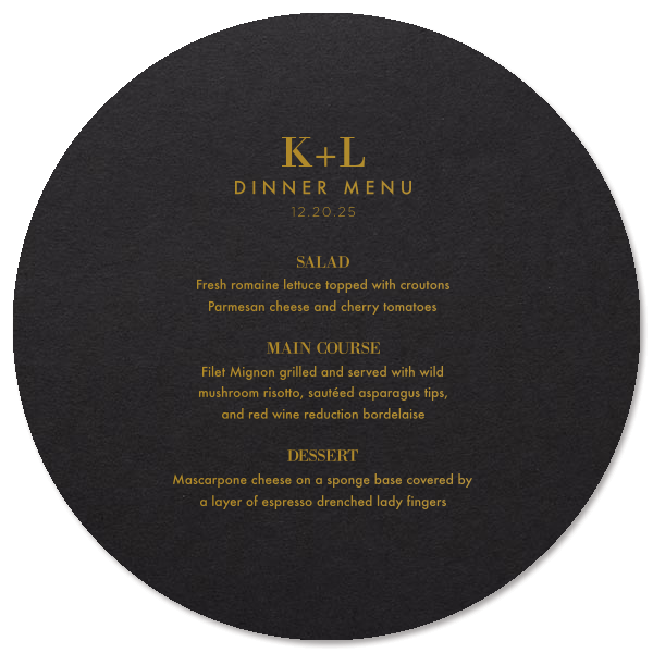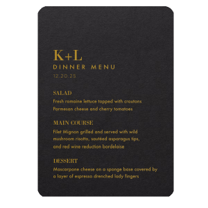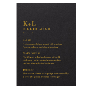 Zoom Show guides Loading product Initials Menu Menu 5"x7" Design ID: 9688 Click on swatch to see options Choose Your Paper Color Active Color Linen Linen Slightly textured, matte finish. Double-sided color. 100lb+ cover stock. Linen Convertible Red Linen Black Linen Slate Linen Antique Gray Linen White Linen Eggshell Linen Ivory Linen Pearl Cream Linen Navy Blue Shiny Shiny Smooth, high-gloss finish. Single-sided color. 100lb+ cover stock. Shiny Black Shiny White Shiny Navy Blue Shiny Fuchsia Shiny Convertible Red Stardream Stardream European Stardream with iridescent finish. Double-sided color. 105lb+ cover stock. Stardream NEW Black Stardream Galvanized Silver Stardream Silver Stardream Crystal White Stardream Ivory Stardream 18k Gold Stardream Champagne Stardream Old Gold Stardream Super Gold Stardream Orange Stardream Rose Gold Stardream Blush Stardream Ballet Pink Stardream Plum Stardream Violet Stardream Lavender Stardream Denim Stardream NEW Peacock Stardream Robin's Egg Blue Poptone Poptone Soft felt texture with matte finish. Double-sided color. 100lb+ cover stock. Poptone Ballet Pink Poptone NEW Fuchsia Poptone Convertible Red Poptone Tangerine Poptone Sunflower Poptone Yellow Poptone Mimosa Poptone Mint Poptone Robin’s Egg Blue Poptone Dark Turquoise Poptone Sky Blue Poptone NEW French Blue Poptone Lavender Natural Natural Smooth, matte finish. Double-sided color. 100lb+ cover stock. Natural NEW Sand Natural Spruce Natural Khaki Natural NEW Kraft Natural Mushroom Natural NEW Chocolate Natural Black Natural Slate Natural Clay Gray Natural Gray Natural Smoke Natural NEW Frost White Natural Ivory Natural Leaf Natural Dark Teal Natural NEW Amethyst Natural Scarlet Natural Antique Rose Natural Harvest Natural Dark Sage Textured Textured Variety of textures. Single-sided color. 110lb+ cover stock. Oak Wood Walnut Wood Ebony Wood Ash Wood Birch Wood Leather Like Tan Leather Like Black Leather Like Pearl Leather Like White Leather Like Night Blue Leather Like Lipstick Red Horizontal White Patterned* - Premium Product Patterned* - Premium Product Smooth, matte finish. Single-sided pattern with white back. Pattern and color may vary between products. 100 lb paper. Premium pricing applies. Marble Sand Marble Gray Marble Navy Marble Taupe Marble Blush Watercolor Seaglass Watercolor Ocean Watercolor Night Fall Watercolor Sangria Watercolor Hibiscus Watercolor Rose Watercolor Sunrise Leaf Sand Leaf Fern Leaf Rain Leaf Rose Blank Stock Blank Stock Blank Stock Glitter* - Premium Product Glitter* - Premium Product Sparkly with a slightly textured finish. Single-sided with a white back and 100lb+ cover stock. Premium pricing applies. Glitter NEW Black Glitter NEW Silver Glitter Champagne Glitter Rose Copper Glitter Night Fall Choose Your Imprint Foil Color Active Color Shiny Foil Shiny Foil Metallic, lustrous finish. *Specialty patterned foil may vary on final print Shiny Champagne Shiny Sterling Silver Shiny 18 Kt Gold Shiny Kiwi / Lime Shiny Leaf Shiny Jade Shiny Royal Blue Shiny Amethyst Shiny Fuchsia Shiny Rose Quartz Shiny Rose Gold NEW Shiny Merlot Shiny Convertible Red Shiny Poppy Shiny Copper *Shiny Holographic Gold *Shiny Holographic Silver *Shiny Rainbow Matte Foil Matte Foil Flat finish. Matte NEW Chocolate Matte Black Matte Slate Gray Matte Dove Grey Matte White Matte Ivory Matte Mimosa Yellow Matte Sunflower Matte Key Lime Matte Leaf Matte Spruce Matte Teal/Peacock Matte Azure Matte Royal Blue Matte Navy Matte Amethyst Matte Pastel Pink Matte Ballet Pink Matte Fuchsia Matte Lipstick Red Matte Merlot Matte Tangerine Satin Foil Satin Foil Muted sheen, brushed finish. Satin Sterling Silver Satin 18 Kt. Gold Satin Copper Penny Satin Fuchsia Satin Lipstick Red Satin Leaf Satin Teal / Peacock Satin French Blue Satin Plum Personalize Your Text Line 1 Line 2 Line 3 Line 4 Line 5 Line 6 Line 7 Line 8 Line 9 Line 10 Line 11 Line 12 Line 13 Personalize further with different fonts, graphics, positioning, and sizes. (Optional) Customize More Choose Your Quantity Subtotal PRICE INCLUDES: Select a Proof Option: Print As Is I confirm that I have reviewed my design and I understand it will be produced as shown and no proof will be provided. Digital Proof + $15 I would like an expert FYP designer to look at my design, make minor corrections if necessary, and send me a black and white proof before the order is produced. Orders delivered as soon as 11.06.2025. Exclusions apply. Share Your Design About This Design Product Details Product Details Minimum order of 25 Measures 5" wide by 7" high Signature foil stamp included Bulk discounts available Expedited shipping options available. Product Description Product Description Our Custom Classic Menu 4.75" x 6.75" is the perfect addition to elevate your party experience! Tailored to your unique theme, this customizable menu adds a touch of elegance and personalization to your celebrations. Whether it's a lavish wedding reception, a milestone birthday bash, or a corporate gala, our Classic Menu enhances the aesthetic of your event. Choose from a wide range of designs and fonts to create a menu that perfectly complements your style. Explore our customizable options at For Your Party to make your event truly unforgettable. Crafted with the utmost quality and attention to detail, our Classic Menu boasts a premium texture that exudes sophistication. Printed on durable, high-grade paper, it withstands the test of time while maintaining its pristine look. With its compact size, it's both convenient to handle and easy to display, ensuring a seamless experience for both hosts and guests. The Classic Menu not only adds an air of refinement to your event but also serves as a functional piece that guides your guests through the culinary journey you've prepared. Elevate your event planning with this exquisite touch. Create your own custom Classic Menu today and discover the joy of adding a personal flair to your special occasions. Product Options Menu 5"x7" Rounded 