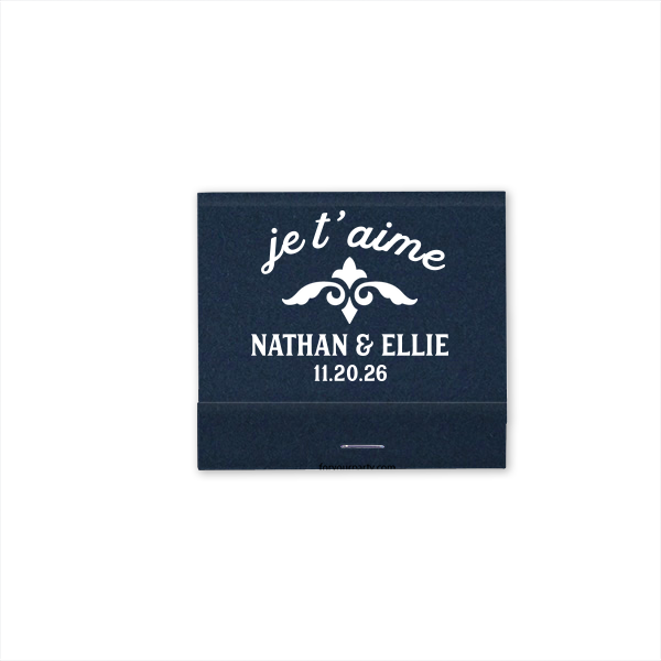 Zoom Show guides Loading product Je T'aime Wedding Matchbook 30-Strike Matchbook Design ID: 169427 Click on swatch to see options Choose Your Paper Color Active Color Shimmer Colors Shimmer Colors Our Stardream papers have a pearl, iridescent quality that creates a sophisticated look and feel. Shimmer Ivory Shimmer Crystal White Shimmer Navy Shimmer Champagne Shimmer Black Ore Shimmer Slate Shimmer 18k Gold Shimmer White Peach Fuzz Shimmer Silver Natural Colors Natural Colors Smooth, matte finish. Double-sided color. 80lb+ cover stock. Natural White Natural Vanilla Natural Black Natural Khaki Natural French Blue Natural NEW Dark Sage Natural Slate Natural Navy Natural Smoke Natural Spruce Natural Hot Pink Natural Lilac Natural Milk Chocolate Choose Your Imprint Foil Color Active Color Shiny Foil Shiny Foil Metallic, lustrous finish. *Specialty patterned foil may vary on final print Shiny Champagne Shiny Sterling Silver Shiny 18 Kt Gold Shiny Kiwi / Lime Shiny Leaf Shiny Jade Shiny Royal Blue Shiny Amethyst Shiny Fuchsia Shiny Rose Quartz Shiny Rose Gold NEW Shiny Merlot Shiny Convertible Red Shiny Poppy Shiny Copper *Shiny Holographic Gold *Shiny Holographic Silver *Shiny Rainbow Matte Foil Matte Foil Flat finish. Matte NEW Chocolate Matte Black Matte Slate Gray Matte Dove Grey Matte White Matte Ivory Matte Mimosa Yellow Matte Sunflower Matte Key Lime Matte Leaf Matte Spruce Matte Teal/Peacock Matte Azure Matte Royal Blue Matte Navy Matte Amethyst Matte Pastel Pink Matte Ballet Pink Matte Fuchsia Matte Lipstick Red Matte Merlot Matte Tangerine Satin Foil Satin Foil Muted sheen, brushed finish. Satin Sterling Silver Satin 18 Kt. Gold Satin Copper Penny Satin Fuchsia Satin Lipstick Red Satin Leaf Satin Teal / Peacock Satin French Blue Satin Plum Personalize Your Text Line 1 Line 2 Personalize further with different fonts, graphics, positioning, and sizes. (Optional) Customize More Choose Your Quantity Subtotal PRICE INCLUDES: Select a Proof Option: Print As Is I confirm that I have reviewed my design and I understand it will be produced as shown and no proof will be provided. Digital Proof + $15 I would like an expert FYP designer to look at my design, make minor corrections if necessary, and send me a black and white proof before the order is produced. Orders delivered as soon as 12.17.2025. Exclusions apply. Share Your Design About This Design Express your love with the Je T’aime Wedding Matchbook. Featuring the timeless fleur-de-lis, this design adds a touch of sophisticated charm and elegance, perfect for celebrating your special day with a hint of French allure. Product Details Product Details a manufacturer’s mark may appear on the bottom edge 50 minimum 2" w X 1.875" h 30 matches Expedited options available a safety message may appear inside the top flap Product Description Product Description For Your Party’s 30 strike matchbooks are the perfect accessory, whether it’s a bowl of them in your apartment or a favor at your wedding! Increasingly the choice of TikTok and those in the know, our 30 strike matchbooks are a perfect way to send a message and stand out. Made out of durable paper stock, our 30 strike matchbooks come in several different colors so you can match (no pun intended) your vibe exactly. Like our classic matchboxes, they come in a wide variety of foil printing options, so get creative and impress your friends! **A manufacturer’s mark will appear on the bottom edge of your matches and a safety message will appear inside the top flap of the matchbook. These are required by law. Minor markings may occur during transit. Product Options 30-Strike Matchbook Barrel Matchbox Classic Matchbox Related Products 30-Strike Matchbook Barrel Matchbox Classic Matchbox