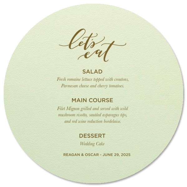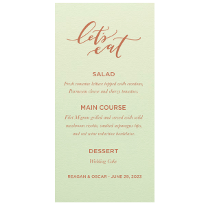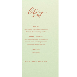 Zoom Show guides Loading product Let's Eat Menu Menu 5"x7" Design ID: 8412 Click on swatch to see options Choose Your Paper Color Active Color Linen Linen Slightly textured, matte finish. Double-sided color. 100lb+ cover stock. Linen Convertible Red Linen Black Linen Slate Linen Antique Gray Linen White Linen Eggshell Linen Ivory Linen Pearl Cream Linen Navy Blue Shiny Shiny Smooth, high-gloss finish. Single-sided color. 100lb+ cover stock. Shiny Black Shiny White Shiny Navy Blue Shiny Fuchsia Shiny Convertible Red Stardream Stardream European Stardream with iridescent finish. Double-sided color. 105lb+ cover stock. Stardream NEW Black Stardream Galvanized Silver Stardream Silver Stardream Crystal White Stardream Ivory Stardream 18k Gold Stardream Champagne Stardream Old Gold Stardream Super Gold Stardream Orange Stardream Rose Gold Stardream Blush Stardream Ballet Pink Stardream Plum Stardream Violet Stardream Lavender Stardream Denim Stardream NEW Peacock Stardream Robin's Egg Blue Poptone Poptone Soft felt texture with matte finish. Double-sided color. 100lb+ cover stock. Poptone Ballet Pink Poptone NEW Fuchsia Poptone Convertible Red Poptone Tangerine Poptone Sunflower Poptone Yellow Poptone Mimosa Poptone Mint Poptone Robin’s Egg Blue Poptone Dark Turquoise Poptone Sky Blue Poptone NEW French Blue Poptone Lavender Natural Natural Smooth, matte finish. Double-sided color. 100lb+ cover stock. Natural NEW Sand Natural Spruce Natural Khaki Natural NEW Kraft Natural Mushroom Natural NEW Chocolate Natural Black Natural Slate Natural Clay Gray Natural Gray Natural Smoke Natural NEW Frost White Natural Ivory Natural Leaf Natural Dark Teal Natural NEW Amethyst Natural Scarlet Natural Antique Rose Natural Harvest Natural Dark Sage Textured Textured Variety of textures. Single-sided color. 110lb+ cover stock. Oak Wood Walnut Wood Ebony Wood Ash Wood Birch Wood Leather Like Tan Leather Like Black Leather Like Pearl Leather Like White Leather Like Night Blue Leather Like Lipstick Red Horizontal White Patterned* - Premium Product Patterned* - Premium Product Smooth, matte finish. Single-sided pattern with white back. Pattern and color may vary between products. 100 lb paper. Premium pricing applies. Marble Sand Marble Gray Marble Navy Marble Taupe Marble Blush Watercolor Seaglass Watercolor Ocean Watercolor Night Fall Watercolor Sangria Watercolor Hibiscus Watercolor Rose Watercolor Sunrise Leaf Sand Leaf Fern Leaf Rain Leaf Rose Blank Stock Blank Stock Blank Stock Glitter* - Premium Product Glitter* - Premium Product Sparkly with a slightly textured finish. Single-sided with a white back and 100lb+ cover stock. Premium pricing applies. Glitter NEW Black Glitter NEW Silver Glitter Champagne Glitter Rose Copper Glitter Night Fall Choose Your Imprint Foil Color Active Color Shiny Foil Shiny Foil Metallic, lustrous finish. *Specialty patterned foil may vary on final print Shiny Champagne Shiny Sterling Silver Shiny 18 Kt Gold Shiny Kiwi / Lime Shiny Leaf Shiny Jade Shiny Royal Blue Shiny Amethyst Shiny Fuchsia Shiny Rose Quartz Shiny Rose Gold NEW Shiny Merlot Shiny Convertible Red Shiny Poppy Shiny Copper *Shiny Holographic Gold *Shiny Holographic Silver *Shiny Rainbow Matte Foil Matte Foil Flat finish. Matte NEW Chocolate Matte Black Matte Slate Gray Matte Dove Grey Matte White Matte Ivory Matte Mimosa Yellow Matte Sunflower Matte Key Lime Matte Leaf Matte Spruce Matte Teal/Peacock Matte Azure Matte Royal Blue Matte Navy Matte Amethyst Matte Pastel Pink Matte Ballet Pink Matte Fuchsia Matte Lipstick Red Matte Merlot Matte Tangerine Satin Foil Satin Foil Muted sheen, brushed finish. Satin Sterling Silver Satin 18 Kt. Gold Satin Copper Penny Satin Fuchsia Satin Lipstick Red Satin Leaf Satin Teal / Peacock Satin French Blue Satin Plum Personalize Your Text Line 1 Line 2 Line 3 Line 4 Line 5 Line 6 Line 7 Line 8 Line 9 Line 10 Personalize further with different fonts, graphics, positioning, and sizes. (Optional) Customize More Choose Your Quantity Subtotal PRICE INCLUDES: Select a Proof Option: Print As Is I confirm that I have reviewed my design and I understand it will be produced as shown and no proof will be provided. Digital Proof + $15 I would like an expert FYP designer to look at my design, make minor corrections if necessary, and send me a black and white proof before the order is produced. Orders delivered as soon as 11.06.2025. Exclusions apply. Share Your Design About This Design Dine in delight with the Let's Eat Menu, playfully scripted to entice your guests. Detail your feast across ten customizable lines, culminating in the couple's names and date, for a tasteful prelude to culinary celebration. Product Details Product Details Minimum order of 25 Measures 5" wide by 7" high Signature foil stamp included Bulk discounts available Expedited shipping options available. Product Description Product Description Our Custom Classic Menu 4.75" x 6.75" is the perfect addition to elevate your party experience! Tailored to your unique theme, this customizable menu adds a touch of elegance and personalization to your celebrations. Whether it's a lavish wedding reception, a milestone birthday bash, or a corporate gala, our Classic Menu enhances the aesthetic of your event. Choose from a wide range of designs and fonts to create a menu that perfectly complements your style. Explore our customizable options at For Your Party to make your event truly unforgettable. Crafted with the utmost quality and attention to detail, our Classic Menu boasts a premium texture that exudes sophistication. Printed on durable, high-grade paper, it withstands the test of time while maintaining its pristine look. With its compact size, it's both convenient to handle and easy to display, ensuring a seamless experience for both hosts and guests. The Classic Menu not only adds an air of refinement to your event but also serves as a functional piece that guides your guests through the culinary journey you've prepared. Elevat