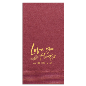Zoom Show guides Loading product Love You Always Napkin Square Cocktail Napkin Design ID: 458547 Click on swatch to see options Choose Your Product Color Active Color 3 ply 3 ply Top quality 3 ply. Dyed tissue. Sand Black Slate Platinum Platinum Pin Dot Dove Gray Dove Gray Borderless White White Borderless White Pin Dot White Scallop Ivory Ivory Borderless Mimosa Lemon Pin Dot Kiwi Kiwi Pin Dot Leaf Pin Dot Spruce Pin Dot Olive Pin Dot Light Navy Dark Turquoise Pin Dot Turquoise Powder Blue Pin Dot Lavender Lavender Pin Dot Purple Merlot Fuchsia Candy Pink Antique Pink Pin Dot Ballet Pink Ballet Pink Borderless Convertible Red Light Coral Merlot Pin Dot Out Until: 2025-12-03 Tangerine Out Until: 2025-11-29 Linen Like* - Premium Product Linen Like* - Premium Product Absorbent. Dyed tissue. Airlaid. Premium pricing applies. Pebble Kraft Metallic Copper Ash Grey Brown Black Charcoal Stone Gray Metallic Silver Fog White Cream Buttercream Metallic Gold Lemon Moss Green Hunter Green Pastel Green Lime Eucalyptus Dark Turquoise Bright Sky Powder Blue Navy Out Until: 2025-12-01 Lavender Berry Merlot Magenta Pink Pastel Pink Lipstick Red Terracotta Peach Mango Ivory Out Until: 2025-12-03 Olive Green Out Until: 2025-12-04 Plum Out Until: 2025-11-13 Crosshatch* - Premium Product Crosshatch* - Premium Product Absorbent. Printed tissue. Airlaid. Premium pricing applies. Crosshatch Black Crosshatch Gray Crosshatch Stone Crosshatch Turquoise Crosshatch Violet Crosshatch Fuchsia Crosshatch Lipstick Red Crosshatch Key Lime Out Until: 2025-11-26 Crosshatch Green Out Until: 2025-12-03 Crosshatch Navy Out Until: 2025-11-24 Woven* - Premium Product Woven* - Premium Product Basketweave texture. Single-sided color. Premium pricing applies. Woven Sand Woven Copper Woven Black Woven Slate Woven Silver Woven Stone Woven Vanilla Woven White Woven Gold Woven Sage Woven Spruce Woven Powder Blue Woven Navy Woven Mauve Woven Convertible Red Woven Tumeric Patterned* - Premium Product Patterned* - Premium Product Exclusive FYP patterns. Single-sided color. Pindot embossed edge. Product pricing applies. Oak Wood Walnut Wood Ebony Wood Ash Wood Birch Wood Marble Sand Marble Gray Marble Navy Marble Taupe Marble Blush Ombre Black Ombre Navy Ombre Robin’s Egg Blue Ombre Rose Petal Ombre Coral Watercolor Sea Glass Watercolor Ocean Watercolor Nightfall Watercolor Sangria Watercolor Hibiscus Watercolor Rose Watercolor Sunrise Leaf Sand Leaf Fern Leaf Rain Leaf Rose Tie Dye Sunflower Tie Dye Leaf Tie Dye Turquoise Tie Dye Fuchsia Shimmer* - Premium Product Shimmer* - Premium Product Elegant European Stardream with iridescent finish. Single-sided color. Pindot embossed edge. Premium pricing applies. Champagne Soft Black Galvanized Silver Crystal White Ivory Pearl Gold Sage Navy Amethyst Herringbone* - Premium Product Herringbone* - Premium Product Absorbent. Printed Herringbone pattern. Airlaid. Premium pricing applies. Herringbone Vanilla Mocha Herringbone Gray Onyx Choose Your Imprint Foil Color Active Color Shiny Foil Shiny Foil Metallic, lustrous finish. *Specialty patterned foil may vary on final print Shiny Champagne Shiny Sterling Silver Shiny 18 Kt Gold Shiny Kiwi / Lime Shiny Leaf Shiny Jade Shiny Royal Blue Shiny Amethyst Shiny Fuchsia Shiny Rose Quartz Shiny Rose Gold NEW Shiny Merlot Shiny Convertible Red Shiny Poppy Shiny Copper *Shiny Holographic Gold *Shiny Holographic Silver *Shiny Rainbow Matte Foil Matte Foil Flat finish. Matte NEW Chocolate Matte Black Matte Slate Gray Matte Dove Grey Matte White Matte Ivory Matte Mimosa Yellow Matte Sunflower Matte Key Lime Matte Leaf Matte Spruce Matte Teal/Peacock Matte Azure Matte Royal Blue Matte Navy Matte Amethyst Matte Pastel Pink Matte Ballet Pink Matte Fuchsia Matte Lipstick Red Matte Merlot Matte Tangerine Satin Foil Satin Foil Muted sheen, brushed finish. Satin Sterling Silver Satin 18 Kt. Gold Satin Copper Penny Satin Fuchsia Satin Lipstick Red Satin Leaf Satin Teal / Peacock Satin French Blue Satin Plum Personalize Your Text Line 1 Personalize further with different fonts, graphics, positioning, and sizes. (Optional) Customize More Choose Your Quantity Subtotal PRICE INCLUDES: Select a Proof Option: Print As Is I confirm that I have reviewed my design and I understand it will be produced as shown and no proof will be provided. Digital Proof + $15 I would like an expert FYP designer to look at my design, make minor corrections if necessary, and send me a black and white proof before the order is produced. Orders delivered as soon as 11.12.2025. Exclusions apply. Share Your Design About This Design Personalized Merlot Cocktail Napkin with Shiny 18 Kt Gold Foil has a Leaf graphic and is good for use in Wedding and Love themed parties and can't be beat. Showcase your style in every detail of your party's theme! Product Details Product Details Classic 3-ply tissue, 4.75” or 5” square Colors vary Signature foil stamp included Bulk discounts available Expedited shipping options available. Product Description Product Description Classic Cocktail Napkins are the perfect companion for any event. Add a touch of refinement to your cocktail parties, weddings, or birthday celebrations. Whether you're sipping a Martini, Old Fashioned, or a signature cocktail, these beverage napkins are the perfect accompaniment to elevate your drink service to new heights.Traditionally designed with a classic pleated edge, highly absorbent, durable, crafted from high-quality, premium-grade paper, our Classic Cocktail Napkins are an excellent, timeless choice. They are soft to the touch, keeping your guests' hands dry and your furniture protected. Once used, simply discard them, making cleanup a breeze. Explore our Cocktail Napkins Collection to find the perfect option for your event. Due to the complexities of manufacturing, the size of the embossed border on our 3-ply napkins may vary slightly. These discrepancies are a natural part of the manufacturing process and do not impact the overal