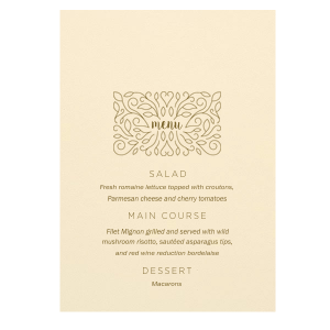 Zoom Show guides Loading product Minimal Floral Frame Menu Menu 5"x7" Design ID: 9642 Click on swatch to see options Choose Your Paper Color Active Color Linen Linen Slightly textured, matte finish. Double-sided color. 100lb+ cover stock. Linen Convertible Red Linen Black Linen Slate Linen Antique Gray Linen White Linen Eggshell Linen Ivory Linen Pearl Cream Linen Navy Blue Shiny Shiny Smooth, high-gloss finish. Single-sided color. 100lb+ cover stock. Shiny Black Shiny White Shiny Navy Blue Shiny Fuchsia Shiny Convertible Red Stardream Stardream European Stardream with iridescent finish. Double-sided color. 105lb+ cover stock. Stardream NEW Black Stardream Galvanized Silver Stardream Silver Stardream Crystal White Stardream Ivory Stardream 18k Gold Stardream Champagne Stardream Old Gold Stardream Super Gold Stardream Orange Stardream Rose Gold Stardream Blush Stardream Ballet Pink Stardream Plum Stardream Violet Stardream Lavender Stardream Denim Stardream NEW Peacock Stardream Robin's Egg Blue Poptone Poptone Soft felt texture with matte finish. Double-sided color. 100lb+ cover stock. Poptone Ballet Pink Poptone NEW Fuchsia Poptone Convertible Red Poptone Tangerine Poptone Sunflower Poptone Yellow Poptone Mimosa Poptone Mint Poptone Robin’s Egg Blue Poptone Dark Turquoise Poptone Sky Blue Poptone NEW French Blue Poptone Lavender Natural Natural Smooth, matte finish. Double-sided color. 100lb+ cover stock. Natural NEW Sand Natural Spruce Natural Khaki Natural NEW Kraft Natural Mushroom Natural NEW Chocolate Natural Black Natural Slate Natural Gray Natural Smoke Natural NEW Frost White Natural Ivory Natural Leaf Natural Dark Teal Natural NEW Amethyst Natural Scarlet Natural Antique Rose Natural Harvest Natural Dark Sage Textured Textured Variety of textures. Single-sided color. 110lb+ cover stock. Oak Wood Walnut Wood Ebony Wood Ash Wood Birch Wood Leather Like Tan Leather Like Black Leather Like Pearl Leather Like White Leather Like Night Blue Leather Like Lipstick Red Horizontal White Patterned* - Premium Product Patterned* - Premium Product Smooth, matte finish. Single-sided pattern with white back. Pattern and color may vary between products. 100 lb paper. Premium pricing applies. Marble Sand Marble Gray Marble Navy Marble Taupe Marble Blush Watercolor Seaglass Watercolor Ocean Watercolor Night Fall Watercolor Sangria Watercolor Hibiscus Watercolor Rose Watercolor Sunrise Leaf Sand Leaf Fern Leaf Rain Leaf Rose Blank Stock Blank Stock Blank Stock Glitter* - Premium Product Glitter* - Premium Product Sparkly with a slightly textured finish. Single-sided with a white back and 100lb+ cover stock. Premium pricing applies. Glitter NEW Black Glitter NEW Silver Glitter Champagne Glitter Rose Copper Glitter Night Fall Choose Your Imprint Foil Color Active Color Shiny Foil Shiny Foil Metallic, lustrous finish. *Specialty patterned foil may vary on final print Shiny Champagne Shiny Sterling Silver Shiny 18 Kt Gold Shiny Kiwi / Lime Shiny Leaf Shiny Jade Shiny Royal Blue Shiny Amethyst Shiny Fuchsia Shiny Rose Quartz Shiny Rose Gold NEW Shiny Merlot Shiny Convertible Red Shiny Poppy Shiny Copper *Shiny Holographic Gold *Shiny Holographic Silver *Shiny Rainbow Matte Foil Matte Foil Flat finish. Matte NEW Chocolate Matte Black Matte Slate Gray Matte Dove Grey Matte White Matte Ivory Matte Mimosa Yellow Matte Sunflower Matte Key Lime Matte Leaf Matte Spruce Matte Teal/Peacock Matte Azure Matte Royal Blue Matte Navy Matte Amethyst Matte Pastel Pink Matte Ballet Pink Matte Fuchsia Matte Lipstick Red Matte Merlot Matte Tangerine Satin Foil Satin Foil Muted sheen, brushed finish. Satin Sterling Silver Satin 18 Kt. Gold Satin Copper Penny Satin Fuchsia Satin Lipstick Red Satin Leaf Satin Teal / Peacock Satin French Blue Satin Plum Personalize Your Text Line 1 Line 2 Line 3 Line 4 Line 5 Line 6 Line 7 Line 8 Line 9 Personalize further with different fonts, graphics, positioning, and sizes. (Optional) Customize More Choose Your Quantity Subtotal PRICE INCLUDES: Select a Proof Option: Print As Is I confirm that I have reviewed my design and I understand it will be produced as shown and no proof will be provided. Digital Proof + $15 I would like an expert FYP designer to look at my design, make minor corrections if necessary, and send me a black and white proof before the order is produced. Orders delivered as soon as 11.17.2025. Exclusions apply. Share Your Design About This Design Shop Classic 5x7 Menu with Foil and Minimal Floral Frame graphic at For Your Party. Customize this menu to complement your Frames, Floral, Trendy themed parties. Product Details Product Details Minimum order of 25 Measures 5" wide by 7" high Signature foil stamp included Bulk discounts available Expedited shipping options available. Product Description Product Description Our Custom Classic Menu 4.75" x 6.75" is the perfect addition to elevate your party experience! Tailored to your unique theme, this customizable menu adds a touch of elegance and personalization to your celebrations. Whether it's a lavish wedding reception, a milestone birthday bash, or a corporate gala, our Classic Menu enhances the aesthetic of your event. Choose from a wide range of designs and fonts to create a menu that perfectly complements your style. Explore our customizable options at For Your Party to make your event truly unforgettable. Crafted with the utmost quality and attention to detail, our Classic Menu boasts a premium texture that exudes sophistication. Printed on durable, high-grade paper, it withstands the test of time while maintaining its pristine look. With its compact size, it's both convenient to handle and easy to display, ensuring a seamless experience for both hosts and guests. The Classic Menu not only adds an air of refinement to your event but also serves as a functional piece that guides your guests through the culinary journey you've prepared. Elevate your event planning with this exquisite touch. Create your own custom Class