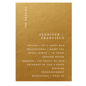 Zoom Show guides Loading product Minimalist Serif Program 4 x 8 Program Design ID: 1820922 Click on swatch to see options Choose Your Paper Color Active Color Linen Linen Slightly textured, matte finish. Double-sided color. 100lb+ cover stock. Linen Convertible Red Linen Black Linen Slate Linen Antique Gray Linen White Linen Eggshell Linen Ivory Linen Pearl Cream Linen Navy Blue Shiny Shiny Smooth, high-gloss finish. Single-sided color. 100lb+ cover stock. Shiny Black Shiny White Shiny Navy Blue Shiny Fuchsia Shiny Convertible Red Stardream Stardream European Stardream with iridescent finish. Double-sided color. 105lb+ cover stock. Stardream NEW Black Stardream Galvanized Silver Stardream Silver Stardream Crystal White Stardream Ivory Stardream 18k Gold Stardream Champagne Stardream Old Gold Stardream Super Gold Stardream Orange Stardream Rose Gold Stardream Blush Stardream Ballet Pink Stardream Plum Stardream Violet Stardream Lavender Stardream Denim Stardream NEW Peacock Stardream Robin's Egg Blue Poptone Poptone Soft felt texture with matte finish. Double-sided color. 100lb+ cover stock. Poptone Ballet Pink Poptone NEW Fuchsia Poptone Convertible Red Poptone Tangerine Poptone Sunflower Poptone Yellow Poptone Mimosa Poptone Mint Poptone Robin’s Egg Blue Poptone Dark Turquoise Poptone Sky Blue Poptone NEW French Blue Poptone Lavender Natural Natural Smooth, matte finish. Double-sided color. 100lb+ cover stock. Natural NEW Sand Natural Spruce Natural Khaki Natural NEW Kraft Natural Mushroom Natural NEW Chocolate Natural Black Natural Slate Natural Gray Natural Smoke Natural NEW Frost White Natural Ivory Natural Leaf Natural Dark Teal Natural NEW Amethyst Natural Scarlet Natural Antique Rose Natural Harvest Natural Dark Sage Textured Textured Variety of textures. Single-sided color. 110lb+ cover stock. Oak Wood Walnut Wood Ebony Wood Ash Wood Birch Wood Leather Like Tan Leather Like Black Leather Like Pearl Leather Like White Leather Like Night Blue Leather Like Lipstick Red Horizontal White Patterned* - Premium Product Patterned* - Premium Product Smooth, matte finish. Single-sided pattern with white back. Pattern and color may vary between products. 100 lb paper. Premium pricing applies. Marble Sand Marble Gray Marble Navy Marble Taupe Marble Blush Watercolor Seaglass Watercolor Ocean Watercolor Night Fall Watercolor Sangria Watercolor Hibiscus Watercolor Rose Watercolor Sunrise Leaf Sand Leaf Fern Leaf Rain Leaf Rose Blank Stock Blank Stock Blank Stock Glitter* - Premium Product Glitter* - Premium Product Sparkly with a slightly textured finish. Single-sided with a white back and 100lb+ cover stock. Premium pricing applies. Glitter NEW Black Glitter NEW Silver Glitter Champagne Glitter Rose Copper Glitter Night Fall Choose Your Imprint Foil Color Active Color Shiny Foil Shiny Foil Metallic, lustrous finish. *Specialty patterned foil may vary on final print Shiny Champagne Shiny Sterling Silver Shiny 18 Kt Gold Shiny Kiwi / Lime Shiny Leaf Shiny Jade Shiny Royal Blue Shiny Amethyst Shiny Fuchsia Shiny Rose Quartz Shiny Rose Gold NEW Shiny Merlot Shiny Convertible Red Shiny Poppy Shiny Copper *Shiny Holographic Gold *Shiny Holographic Silver *Shiny Rainbow Matte Foil Matte Foil Flat finish. Matte NEW Chocolate Matte Black Matte Slate Gray Matte Dove Grey Matte White Matte Ivory Matte Mimosa Yellow Matte Sunflower Matte Key Lime Matte Leaf Matte Spruce Matte Teal/Peacock Matte Azure Matte Royal Blue Matte Navy Matte Amethyst Matte Pastel Pink Matte Ballet Pink Matte Fuchsia Matte Lipstick Red Matte Merlot Matte Tangerine Satin Foil Satin Foil Muted sheen, brushed finish. Satin Sterling Silver Satin 18 Kt. Gold Satin Copper Penny Satin Fuchsia Satin Lipstick Red Satin Leaf Satin Teal / Peacock Satin French Blue Satin Plum Personalize Your Text Line 1 Line 2 Line 3 Line 4 Line 5 Line 6 Line 7 Line 8 Line 9 Line 10 Line 11 Line 12 Personalize further with different fonts, graphics, positioning, and sizes. (Optional) Customize More Choose Your Quantity Subtotal PRICE INCLUDES: Select a Proof Option: Print As Is I confirm that I have reviewed my design and I understand it will be produced as shown and no proof will be provided. Digital Proof + $15 I would like an expert FYP designer to look at my design, make minor corrections if necessary, and send me a black and white proof before the order is produced. Orders delivered as soon as 11.14.2025. Exclusions apply. Share Your Design About This Design Our personalized Stardream Old Gold 4x8 Program with Matte White Foil are a must-have for your next event—whatever the celebration! Product Details Product Details Minimum order of 25 Measures 4" wide by 8" high Signature foil stamp included Bulk discounts available Expedited shipping options available. Product Options 4 x 8 Program 4.5 x 10 Program Program 5"x7" Rounded Corner Program 5"x7" Related Products 4 x 8 Program 4.5 x 10 Program Program 5"x7" Rounded Corner Program 5"x7"