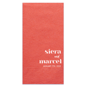 Zoom Show guides Loading product Modern Bold Names Wedding Napkin Square Cocktail Napkin Design ID: 1180724 Click on swatch to see options Choose Your Product Color Active Color 3 ply 3 ply Top quality 3 ply. Dyed tissue. Sand Black Slate Platinum Platinum Pin Dot Dove Gray Dove Gray Borderless White White Borderless White Pin Dot White Scallop Ivory Ivory Borderless Mimosa Lemon Pin Dot Kiwi Kiwi Pin Dot Leaf Pin Dot Spruce Pin Dot Olive Pin Dot Light Navy Dark Turquoise Pin Dot Turquoise Powder Blue Pin Dot Lavender Lavender Pin Dot Purple Fuchsia Candy Pink Antique Pink Pin Dot Ballet Pink Ballet Pink Borderless Convertible Red Light Coral Merlot Out Until: 2025-11-06 Merlot Pin Dot Out Until: 2025-11-28 Tangerine Out Until: 2025-10-28 Linen Like* - Premium Product Linen Like* - Premium Product Absorbent. Dyed tissue. Airlaid. Premium pricing applies. Pebble Kraft Metallic Copper Ash Grey Black Charcoal Stone Gray Metallic Silver Fog White Ivory Cream Buttercream Metallic Gold Lemon Moss Green Olive Green Hunter Green Pastel Green Lime Eucalyptus Dark Turquoise Bright Sky Powder Blue Navy Lavender Berry Merlot Magenta Pink Pastel Pink Lipstick Red Terracotta Peach Mango Brown Out Until: 2025-11-21 Plum Out Until: 2025-11-13 Crosshatch* - Premium Product Crosshatch* - Premium Product Absorbent. Printed tissue. Airlaid. Premium pricing applies. Crosshatch Black Crosshatch Gray Crosshatch Stone Crosshatch Green Crosshatch Turquoise Crosshatch Violet Crosshatch Fuchsia Crosshatch Lipstick Red Crosshatch Key Lime Out Until: 2025-11-26 Crosshatch Navy Out Until: 2025-11-24 Woven* - Premium Product Woven* - Premium Product Basketweave texture. Single-sided color. Premium pricing applies. Woven Sand Woven Copper Woven Black Woven Slate Woven Silver Woven Stone Woven Vanilla Woven White Woven Gold Woven Sage Woven Spruce Woven Powder Blue Woven Navy Woven Mauve Woven Convertible Red Woven Tumeric Patterned* - Premium Product Patterned* - Premium Product Exclusive FYP patterns. Single-sided color. Pindot embossed edge. Product pricing applies. Oak Wood Walnut Wood Ebony Wood Ash Wood Birch Wood Marble Sand Marble Gray Marble Navy Marble Taupe Marble Blush Ombre Black Ombre Navy Ombre Robin’s Egg Blue Ombre Rose Petal Ombre Coral Watercolor Sea Glass Watercolor Ocean Watercolor Nightfall Watercolor Sangria Watercolor Hibiscus Watercolor Rose Watercolor Sunrise Leaf Sand Leaf Fern Leaf Rain Leaf Rose Tie Dye Sunflower Tie Dye Leaf Tie Dye Turquoise Tie Dye Fuchsia Shimmer* - Premium Product Shimmer* - Premium Product Elegant European Stardream with iridescent finish. Single-sided color. Pindot embossed edge. Premium pricing applies. Champagne Soft Black Galvanized Silver Crystal White Ivory Pearl Gold Sage Navy Amethyst Herringbone* - Premium Product Herringbone* - Premium Product Absorbent. Printed Herringbone pattern. Airlaid. Premium pricing applies. Herringbone Vanilla Mocha Herringbone Gray Onyx Choose Your Imprint Foil Color Active Color Shiny Foil Shiny Foil Metallic, lustrous finish. *Specialty patterned foil may vary on final print Shiny Champagne Shiny Sterling Silver Shiny 18 Kt Gold Shiny Kiwi / Lime Shiny Leaf Shiny Jade Shiny Royal Blue Shiny Amethyst Shiny Fuchsia Shiny Rose Quartz Shiny Rose Gold NEW Shiny Merlot Shiny Convertible Red Shiny Poppy Shiny Copper *Shiny Holographic Gold *Shiny Holographic Silver *Shiny Rainbow Matte Foil Matte Foil Flat finish. Matte NEW Chocolate Matte Black Matte Slate Gray Matte Dove Grey Matte White Matte Ivory Matte Mimosa Yellow Matte Sunflower Matte Key Lime Matte Leaf Matte Spruce Matte Teal/Peacock Matte Azure Matte Royal Blue Matte Navy Matte Amethyst Matte Pastel Pink Matte Ballet Pink Matte Fuchsia Matte Lipstick Red Matte Merlot Matte Tangerine Satin Foil Satin Foil Muted sheen, brushed finish. Satin Sterling Silver Satin 18 Kt. Gold Satin Copper Penny Satin Fuchsia Satin Lipstick Red Satin Leaf Satin Teal / Peacock Satin French Blue Satin Plum Personalize Your Text Line 1 Line 2 Line 3 Personalize further with different fonts, graphics, positioning, and sizes. (Optional) Customize More Choose Your Quantity Subtotal PRICE INCLUDES: Select a Proof Option: Print As Is I confirm that I have reviewed my design and I understand it will be produced as shown and no proof will be provided. Digital Proof + $15 I would like an expert FYP designer to look at my design, make minor corrections if necessary, and send me a black and white proof before the order is produced. Orders delivered as soon as 11.04.2025. Exclusions apply. Share Your Design About This Design Celebrate the stars of the show with the Modern Bold Names Wedding Napkin design, where the couple's names take center stage in a striking modern font. An elegant script links their names, with the significant date completing this boldly contemporary yet intimate design. Product Details Product Details Classic 3-ply tissue, 4.75” or 5” square Colors vary Signature foil stamp included Bulk discounts available Expedited shipping options available. Product Description Product Description Classic Cocktail Napkins are the perfect companion for any event. Add a touch of refinement to your cocktail parties, weddings, or birthday celebrations. Whether you're sipping a Martini, Old Fashioned, or a signature cocktail, these beverage napkins are the perfect accompaniment to elevate your drink service to new heights.Traditionally designed with a classic pleated edge, highly absorbent, durable, crafted from high-quality, premium-grade paper, our Classic Cocktail Napkins are an excellent, timeless choice. They are soft to the touch, keeping your guests' hands dry and your furniture protected. Once used, simply discard them, making cleanup a breeze. Explore our Cocktail Napkins Collection to find the perfect option for your event. Due to the complexities of manufacturing, the size of the embossed border on our 3-ply napkins may vary slightly. These discrepancies are a natural part of the manufacturin