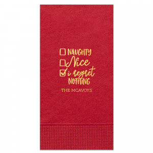 Zoom Show guides Loading product Naughty or Nice Napkin Square Linen Like Cocktail Napkin Design ID: 2584342 Click on swatch to see options Choose Your Product Color Active Color Linen Like* - Premium Product Linen Like* - Premium Product Absorbent. Dyed tissue. Airlaid. Premium pricing applies. Pebble Kraft Ash Grey Black Charcoal Stone Gray Fog White Ivory Cream Buttercream Lemon Moss Green Olive Green Hunter Green Pastel Green Lime Eucalyptus Dark Turquoise Bright Sky Powder Blue Navy Lavender Berry Merlot Magenta Pink Pastel Pink Lipstick Red Terracotta Peach Mango Metallic Silver Metallic Gold Metallic Copper Brown Out Until: 2025-11-21 Plum Out Until: 2025-11-13 Crosshatch* - Premium Product Crosshatch* - Premium Product Absorbent. Printed tissue. Airlaid. Premium pricing applies. Crosshatch Black Crosshatch Gray Crosshatch Stone Crosshatch Turquoise Crosshatch Violet Crosshatch Fuchsia Crosshatch Lipstick Red Crosshatch Key Lime Out Until: 2025-11-26 Crosshatch Green Out Until: 2025-11-29 Crosshatch Navy Out Until: 2025-11-24 Herringbone* - Premium Product Herringbone* - Premium Product Absorbent. Printed Herringbone pattern. Airlaid. Premium pricing applies. Herringbone Vanilla Mocha Herringbone Gray Onyx Choose Your Imprint Foil Color Active Color Shiny Foil Shiny Foil Metallic, lustrous finish. *Specialty patterned foil may vary on final print Shiny Champagne Shiny Sterling Silver Shiny 18 Kt Gold Shiny Kiwi / Lime Shiny Leaf Shiny Jade Shiny Royal Blue Shiny Amethyst Shiny Fuchsia Shiny Rose Quartz Shiny Rose Gold NEW Shiny Merlot Shiny Convertible Red Shiny Poppy Shiny Copper *Shiny Holographic Gold *Shiny Holographic Silver *Shiny Rainbow Matte Foil Matte Foil Flat finish. Matte NEW Chocolate Matte Black Matte Slate Gray Matte Dove Grey Matte White Matte Ivory Matte Mimosa Yellow Matte Sunflower Matte Key Lime Matte Leaf Matte Spruce Matte Teal/Peacock Matte Azure Matte Royal Blue Matte Navy Matte Amethyst Matte Pastel Pink Matte Ballet Pink Matte Fuchsia Matte Lipstick Red Matte Merlot Matte Tangerine Satin Foil Satin Foil Muted sheen, brushed finish. Satin Sterling Silver Satin 18 Kt. Gold Satin Copper Penny Satin Fuchsia Satin Lipstick Red Satin Leaf Satin Teal / Peacock Satin French Blue Satin Plum Personalize Your Text Line 1 Personalize further with different fonts, graphics, positioning, and sizes. (Optional) Customize More Choose Your Quantity Subtotal PRICE INCLUDES: Select a Proof Option: Print As Is I confirm that I have reviewed my design and I understand it will be produced as shown and no proof will be provided. Digital Proof + $15 I would like an expert FYP designer to look at my design, make minor corrections if necessary, and send me a black and white proof before the order is produced. Orders delivered as soon as 11.07.2025. Exclusions apply. Share Your Design About This Design ForYourParty's personalized Convertible Red Cocktail Napkin with Shiny 18 Kt Gold Foil has a Naughty Nice graphic and is good for use in Christmas, Holiday, Words themed parties and will add that special attention to detail that cannot be overlooked. Product Details Product Details Deluxe air laid paper Measures approximately 5" x 5" Signature foil stamp included Bulk discounts available Expedited shipping options available. Product Description Product Description Introducing our custom Linen-Like Cocktail Napkins, the epitome of elegance and refinement for your sophisticated gatherings. Whether you're hosting a formal wedding reception or a chic cocktail soirée, these linen cocktail napkins effortlessly complement any table setting. Their soft and gentle touch will leave a lasting impression on guests, showcasing your commitment to providing a truly upscale experience. Meticulously crafted, these napkins exude the luxurious look and feel of fine linen while offering the convenience of being disposable. Crafted from premium-quality materials, they are highly absorbent and the same dimensions as our classic cocktail napkins. With the perfect blend of functionality and elegance, you can elevate any upscale bar or lounge. Product Options Square Linen Like Cocktail Napkin Square Cocktail Napkin Paper Guest Towel Paper Guest Towel Shimmer Guest Hand Towel Square Petite Napkin Square Luncheon Napkin Related Products Square Linen Like Cocktail Napkin Square Cocktail Napkin Paper Guest Towel Paper Guest Towel Shimmer Guest Hand Towel Square Petite Napkin Square Luncheon Napkin