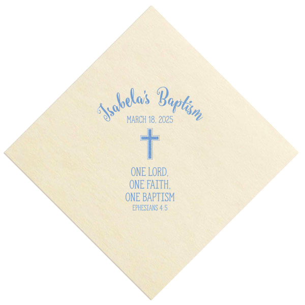 Zoom Show guides Loading product One Baptism Napkin Diamond Linen Like Cocktail Napkin Design ID: 1338279 Click on swatch to see options Choose Your Napkin Color Active Color Linen Like* - Premium Product Linen Like* - Premium Product Absorbent. Dyed tissue. Airlaid. Premium pricing applies. Pebble Kraft Ash Grey Black Charcoal Stone Gray Fog White Cream Buttercream Ivory Lemon Moss Green Olive Green Hunter Green Pastel Green Lime Eucalyptus Dark Turquoise Bright Sky Powder Blue Navy Lavender Berry Merlot Magenta Pastel Pink Pink Lipstick Red Terracotta Peach Mango Metallic Silver Metallic Gold Metallic Copper Brown Out Until: 2025-11-21 Plum Out Until: 2025-11-13 Crosshatch* - Premium Product Crosshatch* - Premium Product Absorbent. Printed tissue. Airlaid. Premium pricing applies. Crosshatch Black Crosshatch Gray Crosshatch Stone Crosshatch Turquoise Crosshatch Violet Crosshatch Fuchsia Crosshatch Lipstick Red Crosshatch Key Lime Out Until: 2025-11-26 Crosshatch Green Out Until: 2025-11-29 Crosshatch Navy Out Until: 2025-11-24 Herringbone* - Premium Product Herringbone* - Premium Product Absorbent. Printed Herringbone pattern. Airlaid. Premium pricing applies. Herringbone Vanilla Mocha Herringbone Gray Onyx Choose Your Imprint Foil Color Active Color Shiny Foil Shiny Foil Metallic, lustrous finish. *Specialty patterned foil may vary on final print Shiny Champagne Shiny Sterling Silver Shiny 18 Kt Gold Shiny Kiwi / Lime Shiny Leaf Shiny Jade Shiny Royal Blue Shiny Amethyst Shiny Fuchsia Shiny Rose Quartz Shiny Rose Gold NEW Shiny Merlot Shiny Convertible Red Shiny Poppy Shiny Copper *Shiny Holographic Gold *Shiny Holographic Silver *Shiny Rainbow Matte Foil Matte Foil Flat finish. Matte NEW Chocolate Matte Black Matte Slate Gray Matte Dove Grey Matte White Matte Ivory Matte Mimosa Yellow Matte Sunflower Matte Key Lime Matte Leaf Matte Spruce Matte Teal/Peacock Matte Azure Matte Royal Blue Matte Navy Matte Amethyst Matte Pastel Pink Matte Ballet Pink Matte Fuchsia Matte Lipstick Red Matte Merlot Matte Tangerine Satin Foil Satin Foil Muted sheen, brushed finish. Satin Sterling Silver Satin 18 Kt. Gold Satin Copper Penny Satin Fuchsia Satin Lipstick Red Satin Leaf Satin Teal / Peacock Satin French Blue Satin Plum Personalize Your Text Line 1 Line 2 Personalize further with different fonts, graphics, positioning, and sizes. (Optional) Customize More Choose Your Quantity Subtotal PRICE INCLUDES: Select a Proof Option: Print As Is I confirm that I have reviewed my design and I understand it will be produced as shown and no proof will be provided. Digital Proof + $15 I would like an expert FYP designer to look at my design, make minor corrections if necessary, and send me a black and white proof before the order is produced. Orders delivered as soon as 11.07.2025. Exclusions apply. Share Your Design About This Design Our beautiful custom Ivory Linen Like Cocktail Napkin with Satin French Blue Foil has a Cross graphic and is good for use in Christian Symbols themed parties and can be personalized to match your party's exact theme and tempo. Product Details Product Details Deluxe air laid paper Measures approximately 5" x 5" Signature foil stamp included Bulk discounts available Expedited shipping options available. Product Description Product Description Introducing our custom Linen-Like Cocktail Napkins, the epitome of elegance and refinement for your sophisticated gatherings. Whether you're hosting a formal wedding reception or a chic cocktail soirée, these linen cocktail napkins effortlessly complement any table setting. Their soft and gentle touch will leave a lasting impression on guests, showcasing your commitment to providing a truly upscale experience. Meticulously crafted, these napkins exude the luxurious look and feel of fine linen while offering the convenience of being disposable. Crafted from premium-quality materials, they are highly absorbent and the same dimensions as our classic cocktail napkins. With the perfect blend of functionality and elegance, you can elevate any upscale bar or lounge. Product Options Diamond Linen Like Cocktail Napkin Paper Guest Towel Diamond Luncheon Napkin Related Products Diamond Linen Like Cocktail Napkin Paper Guest Towel Diamond Luncheon Napkin