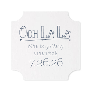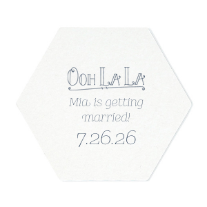 Zoom Show guides Loading product Ooh La La Coaster Nouveau Design ID: 3250 Click on swatch to see options Choose Your Product Color Active Color Coaster Colors Coaster Colors Black White Choose Your Imprint Foil Color Active Color Shiny Foil Shiny Foil Metallic, lustrous finish. *Specialty patterned foil may vary on final print Shiny Champagne Shiny Sterling Silver Shiny 18 Kt Gold Shiny Kiwi / Lime Shiny Leaf Shiny Jade Shiny Royal Blue Shiny Amethyst Shiny Fuchsia Shiny Rose Quartz Shiny Rose Gold NEW Shiny Merlot Shiny Convertible Red Shiny Poppy Shiny Copper *Shiny Holographic Gold *Shiny Holographic Silver *Shiny Rainbow Matte Foil Matte Foil Flat finish. Matte NEW Chocolate Matte Black Matte Slate Gray Matte Dove Grey Matte White Matte Ivory Matte Mimosa Yellow Matte Sunflower Matte Key Lime Matte Leaf Matte Spruce Matte Teal/Peacock Matte Azure Matte Royal Blue Matte Navy Matte Amethyst Matte Pastel Pink Matte Ballet Pink Matte Fuchsia Matte Lipstick Red Matte Merlot Matte Tangerine Satin Foil Satin Foil Muted sheen, brushed finish. Satin Sterling Silver Satin 18 Kt. Gold Satin Copper Penny Satin Fuchsia Satin Lipstick Red Satin Leaf Satin Teal / Peacock Satin French Blue Satin Plum Personalize Your Text Line 2 Line 4 Personalize further with different fonts, graphics, positioning, and sizes. (Optional) Customize More Choose Your Quantity Subtotal PRICE INCLUDES: Select a Proof Option: Print As Is I confirm that I have reviewed my design and I understand it will be produced as shown and no proof will be provided. Digital Proof + $15 I would like an expert FYP designer to look at my design, make minor corrections if necessary, and send me a black and white proof before the order is produced. Orders delivered as soon as 12.19.2025. Exclusions apply. Share Your Design About This Design Personalized Blush with Kraft back Nouveau Coaster with Matte Navy Foil Color has a Ooh La La graphic and is good for use in Words themed parties and can't be beat. Showcase your style in every detail of your party's theme! Product Details Product Details Minimum order of 50 Measures 4" wide Made from reusable uncoated pulp board Bulk discounts available Expedited shipping options available. Product Description Product Description Fancy Coasters are the perfect companion for any barware need. The nouveau shape of the coaster adds a bit of flair for your cocktail party, wedding, anniversary, engagement party or reunion. Whether you’re sipping a Manhattan, Whiskey Sour, or a signature cocktail, these coasters are the perfect accompaniment to elevate your bar accessories to new heights. The fancy coaster is designed on uncoated pulp board making it durable for several reuses. One side of the coaster is kraft color and the other side is blush. You get to decide which color is used to have writing and artwork added to it. The coaster will keep your furniture protected as guests place down drinks as they are chatting with family and/or friends. Once used, you can keep them as a memento or discard them, making cleanup a breeze. Product Options Nouveau Deco Hexagon Coaster Related Products Nouveau Deco Hexagon Coaster Material Pulp Board