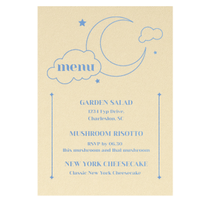 Zoom Show guides Loading product Over the Moon Menu Arch Menu 5 x 7 Design ID: 2552520 Click on swatch to see options Choose Your Paper Color Active Color Linen Linen Slightly textured, matte finish. Double-sided color. 100lb+ cover stock. Linen Convertible Red Linen Black Linen Slate Linen Antique Gray Linen White Linen Eggshell Linen Ivory Linen Pearl Cream Linen Navy Blue Shiny Shiny Smooth, high-gloss finish. Single-sided color. 100lb+ cover stock. Shiny Black Shiny White Shiny Navy Blue Shiny Fuchsia Shiny Convertible Red Stardream Stardream European Stardream with iridescent finish. Double-sided color. 105lb+ cover stock. Stardream NEW Black Stardream Galvanized Silver Stardream Silver Stardream Crystal White Stardream Ivory Stardream 18k Gold Stardream Champagne Stardream Old Gold Stardream Super Gold Stardream Orange Stardream Rose Gold Stardream Blush Stardream Ballet Pink Stardream Plum Stardream Violet Stardream Lavender Stardream Denim Stardream NEW Peacock Stardream Robin's Egg Blue Poptone Poptone Soft felt texture with matte finish. Double-sided color. 100lb+ cover stock. Poptone Ballet Pink Poptone NEW Fuchsia Poptone Convertible Red Poptone Tangerine Poptone Sunflower Poptone Yellow Poptone Mimosa Poptone Mint Poptone Robin’s Egg Blue Poptone Dark Turquoise Poptone Sky Blue Poptone NEW French Blue Poptone Lavender Natural Natural Smooth, matte finish. Double-sided color. 100lb+ cover stock. Natural NEW Sand Natural Spruce Natural Khaki Natural NEW Kraft Natural Mushroom Natural NEW Chocolate Natural Black Natural Slate Natural Clay Gray Natural Gray Natural Smoke Natural NEW Frost White Natural Ivory Natural Leaf Natural Dark Teal Natural NEW Amethyst Natural Scarlet Natural Antique Rose Natural Harvest Natural Dark Sage Textured Textured Variety of textures. Single-sided color. 110lb+ cover stock. Oak Wood Walnut Wood Ebony Wood Ash Wood Birch Wood Leather Like Tan Leather Like Black Leather Like Pearl Leather Like White Leather Like Night Blue Leather Like Lipstick Red Horizontal White Patterned* - Premium Product Patterned* - Premium Product Smooth, matte finish. Single-sided pattern with white back. Pattern and color may vary between products. 100 lb paper. Premium pricing applies. Marble Sand Marble Gray Marble Navy Marble Taupe Marble Blush Watercolor Seaglass Watercolor Ocean Watercolor Night Fall Watercolor Sangria Watercolor Hibiscus Watercolor Rose Watercolor Sunrise Leaf Sand Leaf Fern Leaf Rain Leaf Rose Blank Stock Blank Stock Blank Stock Glitter* - Premium Product Glitter* - Premium Product Sparkly with a slightly textured finish. Single-sided with a white back and 100lb+ cover stock. Premium pricing applies. Glitter NEW Black Glitter NEW Silver Glitter Champagne Glitter Rose Copper Glitter Night Fall Choose Your Imprint Foil Color Active Color Shiny Foil Shiny Foil Metallic, lustrous finish. *Specialty patterned foil may vary on final print Shiny Champagne Shiny Sterling Silver Shiny 18 Kt Gold Shiny Kiwi / Lime Shiny Leaf Shiny Jade Shiny Royal Blue Shiny Amethyst Shiny Fuchsia Shiny Rose Quartz Shiny Rose Gold NEW Shiny Merlot Shiny Convertible Red Shiny Poppy Shiny Copper *Shiny Holographic Gold *Shiny Holographic Silver *Shiny Rainbow Matte Foil Matte Foil Flat finish. Matte NEW Chocolate Matte Black Matte Slate Gray Matte Dove Grey Matte White Matte Ivory Matte Mimosa Yellow Matte Sunflower Matte Key Lime Matte Leaf Matte Spruce Matte Teal/Peacock Matte Azure Matte Royal Blue Matte Navy Matte Amethyst Matte Pastel Pink Matte Ballet Pink Matte Fuchsia Matte Lipstick Red Matte Merlot Matte Tangerine Satin Foil Satin Foil Muted sheen, brushed finish. Satin Sterling Silver Satin 18 Kt. Gold Satin Copper Penny Satin Fuchsia Satin Lipstick Red Satin Leaf Satin Teal / Peacock Satin French Blue Satin Plum Personalize Your Text Line 1 Line 2 Line 3 Line 4 Line 5 Line 6 Line 7 Line 8 Line 9 Personalize further with different fonts, graphics, positioning, and sizes. (Optional) Customize More Choose Your Quantity Subtotal PRICE INCLUDES: Select a Proof Option: Print As Is I confirm that I have reviewed my design and I understand it will be produced as shown and no proof will be provided. Digital Proof + $15 I would like an expert FYP designer to look at my design, make minor corrections if necessary, and send me a black and white proof before the order is produced. Orders delivered as soon as 11.06.2025. Exclusions apply. Share Your Design About This Design If you are planning a celestial event, this menu is for you! Featuring a night sky motif, you can personalize with what's on the menu and the location of your event. Product Details Product Details Minimum order of 25 Measures 5" wide by 7" high Signature foil stamp included Bulk discounts available Expedited shipping options available. Product Description Product Description Our Custom Classic Menu 4.75" x 6.75" is the perfect addition to elevate your party experience! Tailored to your unique theme, this customizable menu adds a touch of elegance and personalization to your celebrations. Whether it's a lavish wedding reception, a milestone birthday bash, or a corporate gala, our Classic Menu enhances the aesthetic of your event. Choose from a wide range of designs and fonts to create a menu that perfectly complements your style. Explore our customizable options at For Your Party to make your event truly unforgettable. Crafted with the utmost quality and attention to detail, our Classic Menu boasts a premium texture that exudes sophistication. Printed on durable, high-grade paper, it withstands the test of time while maintaining its pristine look. With its compact size, it's both convenient to handle and easy to display, ensuring a seamless experience for both hosts and guests. The Classic Menu not only adds an air of refinement to your event but also serves as a functional piece that guides your guests through the culinary journey you've prepared. Elevate your event planning with this exquisite touch. Creat