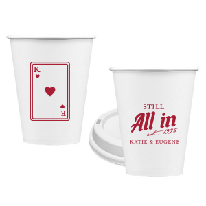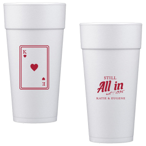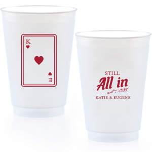 Zoom Show guides Loading product Playing Card Still All In Anniversary Cup 12-oz. Frosted Cup Design ID: 2875614 Click on swatch to see options Choose Your Screen Print Active Color Metallic Cup Ink Metallic Cup Ink Silver Ink Gold Ink Copper Ink Matte Cup Ink Matte Cup Ink Matte Chocolate Ink Matte Black Ink Matte Slate Gray Ink Matte White Ink Matte Sunflower Ink Matte Moss Green Ink Matte Sage Ink Matte Leaf Ink Matte Spruce Matte Teal/Peacock Ink Matte Sky Blue Ink Matte French Blue Ink Matte Royal Blue Ink Matte Navy Ink Matte Cobalt Ink Matte Lavender Ink Matte Ballet Pink Ink Matte Fuchsia Ink Matte Lipstick Red Ink Matte Merlot Ink Matte Tangerine Ink Personalize Your Text Line 1 Line 2 Line 3 Line 4 Personalize further with different fonts, graphics, positioning, and sizes. (Optional) Customize More Choose Your Quantity Subtotal PRICE INCLUDES: Select a Proof Option: Print As Is I confirm that I have reviewed my design and I understand it will be produced as shown and no proof will be provided. Digital Proof + $15 I would like an expert FYP designer to look at my design, make minor corrections if necessary, and send me a black and white proof before the order is produced. Orders delivered as soon as 11.07.2025. Exclusions apply. Share Your Design About This Design Celebrate lasting love with the Playing Card Still All In Anniversary Cup. One side adorns a hearts playing card graphic, personalized with your initials. The other side is inscribed with "Still All In," alongside the celebratory year and the couple's names, symbolizing a winning hand in marriage. Product Details Product Details Minimum order of 50 Measures 4.25" tall and 3.25" wide at the top Holds 11.10 oz flush fill volume Perfect for mixed drinks and signature cocktails BPA-free and recyclable Shatterproof and top-rack dishwasher safe Bulk discounts available Expedited shipping options available. Product Description Product Description Frost flex cups from For Your Party are a perfect accessory for any event, from weddings to birthdays. Their translucent plastic complements any drink or color scheme, and can have any art you can imagine. They’re also reusable, so your guests can have a keepsake from your special day. Like our 10 oz. frost flex cups, our 12 oz. frost flex cups are made in the USA, BPA free, and can be hand-washed again and again to remember your event. Our 12 oz. size has the same shape as our 10 oz. size, and is perfect for when you want just a little more space. It has a flush fill volume of 11.1 oz. Product Options 12-oz. Frosted Cup 14-oz.Frosted Cup 16-oz. Frosted Cup 20-oz. Frosted Cup 24-oz. Frosted Cup 10-oz.Frosted Cup 9-oz. Frosted Cup 16-oz.Stadium Cup 22-oz. Stadium Cup 32-oz. Stadium Cup 12-oz. Styrofoam Cup 16-oz. Styrofoam Cup 20-oz. Styrofoam Cup 24-oz. Styrofoam Cup 32-oz. Styrofoam Cup 16-oz. Color Changing Cup 8oz Paper Cup 12oz Paper Cup 16oz Paper Cup 8oz Paper Cup 12oz Paper Cup 16oz Paper Cup 20oz Paper Cup 24oz Paper Cup Related Products 12-oz. Frosted Cup 14-oz.Frosted Cup 16-oz. Frosted Cup 20-oz. Frosted Cup 24-oz. Frosted Cup 10-oz.Frosted Cup 9-oz. Frosted Cup 16-oz.Stadium Cup 22-oz. Stadium Cup 32-oz. Stadium Cup 12-oz. Styrofoam Cup 16-oz. Styrofoam Cup 20-oz. Styrofoam Cup 24-oz. Styrofoam Cup 32-oz. Styrofoam Cup 16-oz. Color Changing Cup 8oz Paper Cup 12oz Paper Cup 16oz Paper Cup 8oz Paper Cup 12oz Paper Cup 16oz Paper Cup 20oz Paper Cup 24oz Paper Cup