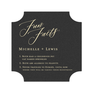 Zoom Show guides Loading product Script Fun Facts Coaster Square Coaster Design ID: 1476518 Click on swatch to see options Choose Your Product Color Active Color Coaster Colors Coaster Colors Black White Eggshell Choose Your Imprint Foil Color Active Color Shiny Foil Shiny Foil Metallic, lustrous finish. *Specialty patterned foil may vary on final print Shiny Champagne Shiny Sterling Silver Shiny 18 Kt Gold Shiny Kiwi / Lime Shiny Leaf Shiny Jade Shiny Royal Blue Shiny Amethyst Shiny Fuchsia Shiny Rose Quartz Shiny Rose Gold NEW Shiny Merlot Shiny Convertible Red Shiny Poppy Shiny Copper *Shiny Holographic Gold *Shiny Holographic Silver *Shiny Rainbow Matte Foil Matte Foil Flat finish. Matte NEW Chocolate Matte Black Matte Slate Gray Matte Dove Grey Matte White Matte Ivory Matte Mimosa Yellow Matte Sunflower Matte Key Lime Matte Leaf Matte Spruce Matte Teal/Peacock Matte Azure Matte Royal Blue Matte Navy Matte Amethyst Matte Pastel Pink Matte Ballet Pink Matte Fuchsia Matte Lipstick Red Matte Merlot Matte Tangerine Satin Foil Satin Foil Muted sheen, brushed finish. Satin Sterling Silver Satin 18 Kt. Gold Satin Copper Penny Satin Fuchsia Satin Lipstick Red Satin Leaf Satin Teal / Peacock Satin French Blue Satin Plum Personalize Your Text Line 1 Line 2 Line 3 Line 4 LIne 5 Line 6 Personalize further with different fonts, graphics, positioning, and sizes. (Optional) Customize More Choose Your Quantity Subtotal PRICE INCLUDES: Select a Proof Option: Print As Is I confirm that I have reviewed my design and I understand it will be produced as shown and no proof will be provided. Digital Proof + $15 I would like an expert FYP designer to look at my design, make minor corrections if necessary, and send me a black and white proof before the order is produced. Orders delivered as soon as 11.06.2025. Exclusions apply. Share Your Design About This Design The ever-popular Eggshell Square Coaster with Matte Navy Foil couldn't be more perfect. It's time to show off your impeccable taste. Product Details Product Details Minimum order of 50 Measures 4" square Made from reusable uncoated pulp board Bulk discounts available Expedited shipping options available. Product Description Product Description Custom Square Coasters are the perfect choice to elevate your event's ambiance while protecting your surfaces in style. These customizable coasters are a versatile addition to weddings, anniversary parties, cocktail soirées, and more. They not only shield your furniture but also serve as chic décor pieces that impress your guests. Crafted from pulp board, our Square Coasters exude premium quality, featuring a smooth texture that adds a touch of elegance to any setting and are made for multiple uses. Their square shape provides ample space for glasses and mugs of all sizes, ensuring convenience during your event. Personalize these coasters with your unique design or event details, making them a memorable keepsake for your guests. Explore our other barware. Product Options Square Coaster Hexagon Coaster Deco Related Products Square Coaster Hexagon Coaster Deco Material Pulp Board