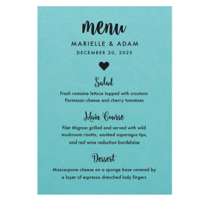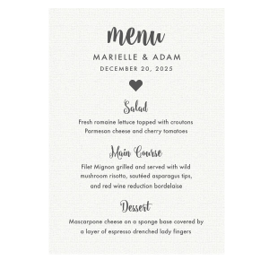 Zoom Show guides Loading product Sweetheart Menu Menu 5"x7" Thermography Design ID: 5432 Click on swatch to see options Choose Your Paper Color Active Color Linen Linen Slightly textured, matte finish. Double-sided color. 100lb+ cover stock. Linen Convertible Red Linen Black Linen Slate Linen Antique Gray Linen White Linen Eggshell Linen Ivory Linen Pearl Cream Linen Navy Blue Shiny Shiny Smooth, high-gloss finish. Single-sided color. 100lb+ cover stock. Shiny Black Shiny White Shiny Navy Blue Shiny Fuchsia Shiny Convertible Red Stardream Stardream European Stardream with iridescent finish. Double-sided color. 105lb+ cover stock. Stardream NEW Black Stardream Galvanized Silver Stardream Silver Stardream Crystal White Stardream Ivory Stardream 18k Gold Stardream Champagne Stardream Old Gold Stardream Super Gold Stardream Orange Stardream Rose Gold Stardream Blush Stardream Ballet Pink Stardream Plum Stardream Violet Stardream Lavender Stardream Denim Stardream NEW Peacock Stardream Robin's Egg Blue Poptone Poptone Soft felt texture with matte finish. Double-sided color. 100lb+ cover stock. Poptone Ballet Pink Poptone NEW Fuchsia Poptone Convertible Red Poptone Tangerine Poptone Sunflower Poptone Yellow Poptone Mimosa Poptone Mint Poptone Robin’s Egg Blue Poptone Dark Turquoise Poptone Sky Blue Poptone NEW French Blue Poptone Lavender Natural Natural Smooth, matte finish. Double-sided color. 100lb+ cover stock. Natural NEW Sand Natural Spruce Natural Khaki Natural NEW Kraft Natural Mushroom Natural NEW Chocolate Natural Black Natural Slate Natural Clay Gray Natural Gray Natural Smoke Natural NEW Frost White Natural Ivory Natural Leaf Natural Dark Teal Natural NEW Amethyst Natural Scarlet Natural Antique Rose Natural Harvest Natural Dark Sage Textured Textured Variety of textures. Single-sided color. 110lb+ cover stock. Oak Wood Walnut Wood Ebony Wood Ash Wood Birch Wood Leather Like Tan Leather Like Black Leather Like Pearl Leather Like White Leather Like Night Blue Leather Like Lipstick Red Horizontal White Patterned* - Premium Product Patterned* - Premium Product Smooth, matte finish. Single-sided pattern with white back. Pattern and color may vary between products. 100 lb paper. Premium pricing applies. Marble Sand Marble Gray Marble Navy Marble Taupe Marble Blush Watercolor Seaglass Watercolor Ocean Watercolor Night Fall Watercolor Sangria Watercolor Hibiscus Watercolor Rose Watercolor Sunrise Leaf Sand Leaf Fern Leaf Rain Leaf Rose Blank Stock Blank Stock Blank Stock Glitter* - Premium Product Glitter* - Premium Product Sparkly with a slightly textured finish. Single-sided with a white back and 100lb+ cover stock. Premium pricing applies. Glitter NEW Black Glitter NEW Silver Glitter Champagne Glitter Rose Copper Glitter Night Fall Choose Your Thermography Color Active Color Thermography Thermography Thermo. Slate Thermo. Gold Thermo. Silver Thermo. Antique Gold Thermo. Chocolate Thermo. Black Thermo. Navy Thermo. Purple Personalize Your Text Line 1 Line 2 Line 3 Line 4 Line 5 Line 6 Line 7 Line 8 Line 9 Line 10 Line 11 Line 12 Personalize further with different fonts, graphics, positioning, and sizes. (Optional) Customize More Choose Your Quantity Subtotal PRICE INCLUDES: Select a Proof Option: Print As Is I confirm that I have reviewed my design and I understand it will be produced as shown and no proof will be provided. Digital Proof + $15 I would like an expert FYP designer to look at my design, make minor corrections if necessary, and send me a black and white proof before the order is produced. Orders delivered as soon as 11.06.2025. Exclusions apply. Share Your Design About This Design The ever-popular Linen White Classic Menu with Thermo. Slate Thermography has a Solid Heart graphic and is good for use in Wedding themed parties and can be customized to complement every last detail of your party. Product Details Product Details Minimum order of 25 Measures 4.75" wide by 6.75" high Features thermography printing Bulk discounts available Expedited shipping options available. Product Description Product Description For Your Party personalized Menus are made from top-quality paper. Colors are coordinated as closely as possible to match our napkin colors, but may not be exact. Menus have multiple layer and design options. Personalize your Menus with text and illustrations from our extensive, designer-curated collection. With over 100 paper colors, 150 fonts, 50 foil colors and 1,300 clipart images, you can create the perfect party accessories for your event. You also have the option to Upload Your Own Art for a truly unique product. Product Options Menu 5"x7" Thermography Menu 5"x7" Foil Stamped Rounded Corner 5"x7" Thermography Rounded Corner 5"x7" Foil Stamped Circle Menu Thermography Circle Menu Foil Stamped Folded Menu Thermography Folded Menu Foil Stamped Menu 5"x7" Related Products Menu 5"x7" Thermography Menu 5"x7" Foil Stamped Rounded Corner 5"x7" Thermography Rounded Corner 5"x7" Foil Stamped Circle Menu Thermography Circle Menu Foil Stamped Folded Menu Thermography Folded Menu Foil Stamped Menu 5"x7"