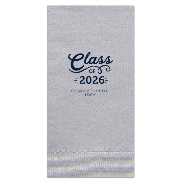 Zoom Show guides Loading product Swirly Class of Graduation Name Napkin Diamond Shimmer Cocktail Napkin Design ID: 201637 Click on swatch to see options Choose Your Napkin Color Active Color Shimmer* - Premium Product Shimmer* - Premium Product Elegant European Stardream with iridescent finish. Single-sided color. Pindot embossed edge. Premium pricing applies. Champagne Soft Black Galvanized Silver Crystal White Ivory Pearl Gold Sage Navy Amethyst Choose Your Imprint Foil Color Active Color Shiny Foil Shiny Foil Metallic, lustrous finish. *Specialty patterned foil may vary on final print Shiny Champagne Shiny Sterling Silver Shiny 18 Kt Gold Shiny Kiwi / Lime Shiny Leaf Shiny Jade Shiny Royal Blue Shiny Amethyst Shiny Fuchsia Shiny Rose Quartz Shiny Rose Gold NEW Shiny Merlot Shiny Convertible Red Shiny Poppy Shiny Copper *Shiny Holographic Gold *Shiny Holographic Silver *Shiny Rainbow Matte Foil Matte Foil Flat finish. Matte NEW Chocolate Matte Black Matte Slate Gray Matte Dove Grey Matte White Matte Ivory Matte Mimosa Yellow Matte Sunflower Matte Key Lime Matte Leaf Matte Spruce Matte Teal/Peacock Matte Azure Matte Royal Blue Matte Navy Matte Amethyst Matte Pastel Pink Matte Ballet Pink Matte Fuchsia Matte Lipstick Red Matte Merlot Matte Tangerine Satin Foil Satin Foil Muted sheen, brushed finish. Satin Sterling Silver Satin 18 Kt. Gold Satin Copper Penny Satin Fuchsia Satin Lipstick Red Satin Leaf Satin Teal / Peacock Satin French Blue Satin Plum Personalize Your Text Line 1 Line 2 Line 3 Personalize further with different fonts, graphics, positioning, and sizes. (Optional) Customize More Choose Your Quantity Subtotal PRICE INCLUDES: Select a Proof Option: Print As Is I confirm that I have reviewed my design and I understand it will be produced as shown and no proof will be provided. Digital Proof + $15 I would like an expert FYP designer to look at my design, make minor corrections if necessary, and send me a black and white proof before the order is produced. Orders delivered as soon as 12.19.2025. Exclusions apply. Share Your Design About This Design The Swirly Class of Graduation Name Napkin design exudes celebratory energy. A playful, swirling script for "Class" and an expansive flourish underneath capture the joy of graduation. Congratulatory wishes and school initials below, accented with light beams, amplify this napkin's vibrant and spirited design. Product Details Product Details Classic 3-ply tissue with select shimmer finish and pindot embossed edge Measures approximately 4.75" to 5" Signature foil stamp included Bulk discounts available Expedited shipping options available. Product Description Product Description Meet the personalized Shimmer Cocktail Napkins, where elegance meets sparkle. These stunning napkins are designed to captivate and impress. Whether you're hosting a lively birthday party, a festive holiday soirée, or an upscale wedding reception, our Shimmer Cocktail Napkins will enhance the atmosphere with their alluring shimmer. Crafted with elegance in mind, our Shimmer Cocktail Napkins feature a delicate shimmering finish that catches the light and creates a mesmerizing effect. Not only do these napkins offer eye-catching aesthetics, but they are also highly practical. Made from premium-quality materials, they are absorbent and reliable, keeping your guests' hands clean and dry. Product Options Diamond Shimmer Cocktail Napkin Diamond Luncheon Napkin Paper Guest Towel Diamond Cocktail Napkin Diamond Linen Like Cocktail Napkin Diamond Petite Napkin Related Products Diamond Shimmer Cocktail Napkin Diamond Luncheon Napkin Paper Guest Towel Diamond Cocktail Napkin Diamond Linen Like Cocktail Napkin Diamond Petite Napkin