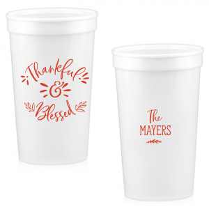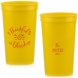 Zoom Show guides Loading product Thankful & Blessed Cup 16-oz.Stadium Cup Design ID: 326749 Click on swatch to see options Choose Your Product Color Active Color Cup Colors Cup Colors Clear Gold Black Silver White Yellow Lime Green Teal Navy Royal Blue Powder Blue Purple Maroon Hot Pink Light Pink Red Orange Choose Your Screen Print Active Color Metallic Cup Ink Metallic Cup Ink Silver Ink Gold Ink Copper Ink Matte Cup Ink Matte Cup Ink Matte Chocolate Ink Matte Black Ink Matte Slate Gray Ink Matte White Ink Matte Sunflower Ink Matte Moss Green Ink Matte Sage Ink Matte Leaf Ink Matte Spruce Matte Teal/Peacock Ink Matte Sky Blue Ink Matte French Blue Ink Matte Royal Blue Ink Matte Navy Ink Matte Cobalt Ink Matte Lavender Ink Matte Ballet Pink Ink Matte Fuchsia Ink Matte Lipstick Red Ink Matte Merlot Ink Matte Tangerine Ink Personalize Your Text Line 1 - Back Personalize further with different fonts, graphics, positioning, and sizes. (Optional) Customize More Choose Your Quantity Subtotal PRICE INCLUDES: Select a Proof Option: Print As Is I confirm that I have reviewed my design and I understand it will be produced as shown and no proof will be provided. Digital Proof + $15 I would like an expert FYP designer to look at my design, make minor corrections if necessary, and send me a black and white proof before the order is produced. Orders delivered as soon as 11.06.2025. Exclusions apply. Share Your Design About This Design Our beautiful custom Gold 16 oz Stadium Cup with Matte White Ink Cup Ink Colors are a must-have for your next event—whatever the celebration! Product Details Product Details Minimum order of 50 Measures 4.375" tall and 3.6" wide at the top Thin manufacturer mark may appear 0.75" to 1" from the bottom of the cup Ideal for beer BPA-free and recyclable Shatterproof and top-rack dishwasher safe Bulk discounts available Expedited shipping options available. Product Description Product Description Want a cup that’s reminiscent of fun parties, fall sports, and great times? Our stadium cups are made of sturdy colorful plastic and are perfect for birthdays, home entertaining, or casual get-togethers. Like our 22 oz. stadium cups, our 16 oz. stadium cups are made of reusable, dishwasher-safe plastic, and are available in colors to match any home or team. Use them for beer or soft drinks at your next tailgate! Product Options 16-oz.Stadium Cup 22-oz. Stadium Cup 32-oz. Stadium Cup 16-oz. Color Changing Cup Related Products 16-oz.Stadium Cup 22-oz. Stadium Cup 32-oz. Stadium Cup 16-oz. Color Changing Cup