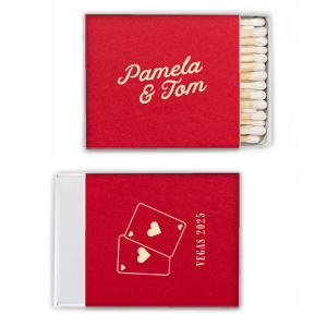 Zoom Show guides Loading product Vegas Baby Cards Matchbox Classic Matchbox Design ID: 2053763 Click on swatch to see options Choose Your Paper Color Active Color Linen Linen Slightly textured, matte finish. Double-sided color. 100lb+ cover stock. Linen Convertible Red Linen Black Linen Slate Linen Antique Gray Linen White Linen Eggshell Linen Ivory Linen Pearl Cream Linen Navy Blue Shiny Shiny Smooth, high-gloss finish. Single-sided color. 100lb+ cover stock. Shiny Black Shiny White Shiny Navy Blue Shiny Fuchsia Shiny Convertible Red Stardream Stardream European Stardream with iridescent finish. Double-sided color. 105lb+ cover stock. Stardream NEW Black Stardream Galvanized Silver Stardream Silver Stardream Crystal White Stardream Ivory Stardream 18k Gold Stardream Champagne Stardream Old Gold Stardream Super Gold Stardream Orange Stardream Rose Gold Stardream Blush Stardream Ballet Pink Stardream Plum Stardream Violet Stardream Lavender Stardream Denim Stardream NEW Peacock Stardream Robin's Egg Blue Poptone Poptone Soft felt texture with matte finish. Double-sided color. 100lb+ cover stock. Poptone Ballet Pink Poptone NEW Fuchsia Poptone Convertible Red Poptone Tangerine Poptone Sunflower Poptone Yellow Poptone Mimosa Poptone Mint Poptone Robin’s Egg Blue Poptone Dark Turquoise Poptone Sky Blue Poptone NEW French Blue Poptone Lavender Natural Natural Smooth, matte finish. Double-sided color. 100lb+ cover stock. Natural NEW Sand Natural Spruce Natural Khaki Natural NEW Kraft Natural Mushroom Natural NEW Chocolate Natural Black Natural Slate Natural Clay Gray Natural Gray Natural Smoke Natural NEW Frost White Natural Ivory Natural Leaf Natural Dark Teal Natural NEW Amethyst Natural Scarlet Natural Antique Rose Natural Harvest Natural Dark Sage Textured Textured Variety of textures. Single-sided color. 110lb+ cover stock. Oak Wood Walnut Wood Ebony Wood Ash Wood Birch Wood Leather Like Tan Leather Like Black Leather Like Pearl Leather Like White Leather Like Night Blue Leather Like Lipstick Red Horizontal White Patterned* - Premium Product Patterned* - Premium Product Smooth, matte finish. Single-sided pattern with white back. Pattern and color may vary between products. 100 lb paper. Premium pricing applies. Marble Sand Marble Gray Marble Navy Marble Taupe Marble Blush Watercolor Seaglass Watercolor Ocean Watercolor Night Fall Watercolor Sangria Watercolor Hibiscus Watercolor Rose Watercolor Sunrise Leaf Sand Leaf Fern Leaf Rain Leaf Rose Blank Stock Blank Stock Blank Stock Glitter* - Premium Product Glitter* - Premium Product Sparkly with a slightly textured finish. Single-sided with a white back and 100lb+ cover stock. Premium pricing applies. Glitter NEW Black Glitter NEW Silver Glitter Champagne Glitter Rose Copper Glitter Night Fall Choose Your Imprint Foil Color Active Color Shiny Foil Shiny Foil Metallic, lustrous finish. *Specialty patterned foil may vary on final print Shiny Champagne Shiny Sterling Silver Shiny 18 Kt Gold Shiny Kiwi / Lime Shiny Leaf Shiny Jade Shiny Royal Blue Shiny Amethyst Shiny Fuchsia Shiny Rose Quartz Shiny Rose Gold NEW Shiny Merlot Shiny Convertible Red Shiny Poppy Shiny Copper *Shiny Holographic Gold *Shiny Holographic Silver *Shiny Rainbow Matte Foil Matte Foil Flat finish. Matte NEW Chocolate Matte Black Matte Slate Gray Matte Dove Grey Matte White Matte Ivory Matte Mimosa Yellow Matte Sunflower Matte Key Lime Matte Leaf Matte Spruce Matte Teal/Peacock Matte Azure Matte Royal Blue Matte Navy Matte Amethyst Matte Pastel Pink Matte Ballet Pink Matte Fuchsia Matte Lipstick Red Matte Merlot Matte Tangerine Satin Foil Satin Foil Muted sheen, brushed finish. Satin Sterling Silver Satin 18 Kt. Gold Satin Copper Penny Satin Fuchsia Satin Lipstick Red Satin Leaf Satin Teal / Peacock Satin French Blue Satin Plum Personalize Your Text Line 1 Line 2 Line 3 Personalize further with different fonts, graphics, positioning, and sizes. (Optional) Customize More Choose Your Quantity Subtotal PRICE INCLUDES: Select a Proof Option: Print As Is I confirm that I have reviewed my design and I understand it will be produced as shown and no proof will be provided. Digital Proof + $15 I would like an expert FYP designer to look at my design, make minor corrections if necessary, and send me a black and white proof before the order is produced. Orders delivered as soon as 11.07.2025. Exclusions apply. Share Your Design About This Design Channeling the iconic glitz of 1950s Las Vegas, the Vegas Baby Cards Matchbox ignites a nostalgic spark with its retro font and playful card illustration. Perfect for a destination wedding, it's a match made in vintage heaven, inviting guests to bet on love and luck in Sin City style. Product Details Product Details Minimum order of 50 Measures 2.22" wide by 1.375" long by 0.46" high Includes approximately 19 matchsticks Expedited shipping options available. Product Description Product Description Our classic matchboxes are the perfect addition to your birthday, wedding, or any other event. A bowl of custom matchboxes is the perfect way to make an impression as a home decor accent or party favor. Your friends and guests will be impressed with your attention to detail!Like our square matchboxes, our classic matchboxes feature a sliding tray for the matches inside a durable cardboard case that’s covered in a paper of your choice. They’re long-lasting, reliable, and can be used with any one of our wide variety of paper colors. Product Options Classic Matchbox Square Matchbox Two-Chamber Matchbox Candle Matchbox Cigar Matchbox Triangle Matchbox Mini Matchbox Related Products Classic Matchbox Square Matchbox Two-Chamber Matchbox Candle Matchbox Cigar Matchbox Triangle Matchbox Mini Matchbox