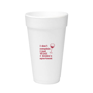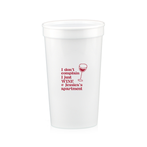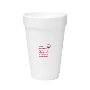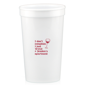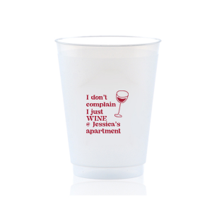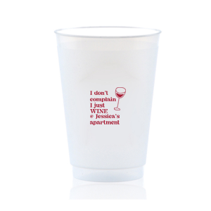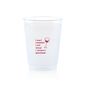 Zoom Show guides Loading product Witty Wine Welcome Cup 12-oz. Frosted Cup Design ID: 2812429 Click on swatch to see options Choose Your Screen Print Active Color Metallic Cup Ink Metallic Cup Ink Silver Ink Gold Ink Copper Ink Matte Cup Ink Matte Cup Ink Matte Chocolate Ink Matte Black Ink Matte Slate Gray Ink Matte White Ink Matte Sunflower Ink Matte Moss Green Ink Matte Sage Ink Matte Leaf Ink Matte Spruce Matte Teal/Peacock Ink Matte Sky Blue Ink Matte French Blue Ink Matte Royal Blue Ink Matte Navy Ink Matte Cobalt Ink Matte Lavender Ink Matte Ballet Pink Ink Matte Fuchsia Ink Matte Lipstick Red Ink Matte Merlot Ink Matte Tangerine Ink Personalize Your Text Line 1 Line 2 Personalize further with different fonts, graphics, positioning, and sizes. (Optional) Customize More Choose Your Quantity Subtotal PRICE INCLUDES: Select a Proof Option: Print As Is I confirm that I have reviewed my design and I understand it will be produced as shown and no proof will be provided. Digital Proof + $15 I would like an expert FYP designer to look at my design, make minor corrections if necessary, and send me a black and white proof before the order is produced. Orders delivered as soon as 11.06.2025. Exclusions apply. Share Your Design About This Design Toast to new beginnings with the Witty Wine Welcome Cup, featuring the clever quip "I don't complain I just wine," topped with a sleek, minimal wine glass drawing. Personalize with your names in a contemporary font for a housewarming filled with laughs and good cheer. Product Details Product Details Minimum order of 50 Measures 4.25" tall and 3.25" wide at the top Holds 11.10 oz flush fill volume Perfect for mixed drinks and signature cocktails BPA-free and recyclable Shatterproof and top-rack dishwasher safe Bulk discounts available Expedited shipping options available. Product Description Product Description Frost flex cups from For Your Party are a perfect accessory for any event, from weddings to birthdays. Their translucent plastic complements any drink or color scheme, and can have any art you can imagine. They’re also reusable, so your guests can have a keepsake from your special day. Like our 10 oz. frost flex cups, our 12 oz. frost flex cups are made in the USA, BPA free, and can be hand-washed again and again to remember your event. Our 12 oz. size has the same shape as our 10 oz. size, and is perfect for when you want just a little more space. It has a flush fill volume of 11.1 oz. Product Options 12-oz. Frosted Cup 14-oz.Frosted Cup 16-oz. Frosted Cup 20-oz. Frosted Cup 24-oz. Frosted Cup 10-oz.Frosted Cup 9-oz. Frosted Cup 5-oz. Frosted Cup 12-oz. Styrofoam Cup 16-oz. Styrofoam Cup 20-oz. Styrofoam Cup 16-oz.Stadium Cup 22-oz. Stadium Cup 32-oz. Stadium Cup Plastic Shot Glass 16-oz. Color Changing Cup 8oz Paper Cup 12oz Paper Cup 16oz Paper Cup 8oz Paper Cup 12oz Paper Cup 16oz Paper Cup 20oz Paper Cup 24oz Paper Cup Related Products 12-oz. Frosted Cup 14-oz.Frosted Cup 16-oz. Frosted Cup 20-oz. Frosted Cup 24-oz. Frosted Cup 10-oz.Frosted Cup 9-oz. Frosted Cup 5-oz. Frosted Cup 12-oz. Styrofoam Cup 16-oz. Styrofoam Cup 20-oz. Styrofoam Cup 16-oz.Stadium Cup 22-oz. Stadium Cup 32-oz. Stadium Cup Plastic Shot Glass 16-oz. Color Changing Cup 8oz Paper Cup 12oz Paper Cup 16oz Paper Cup 8oz Paper Cup 12oz Paper Cup 16oz Paper Cup 20oz Paper Cup 24oz Paper Cup